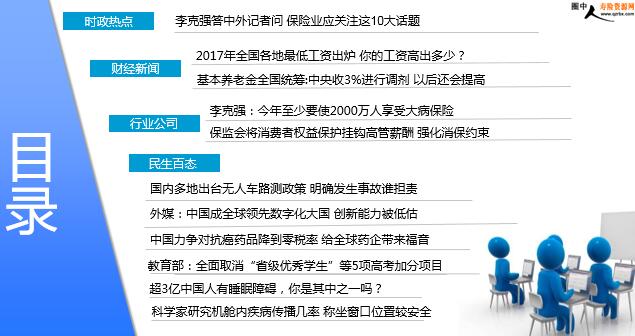 2017年3月22日 星期四 每日新闻速递 时政热点 财经新闻 行业公司 民生百态 李克强答中外记者问 保险业应关注这10大话题 2017年全国各地最低工资出炉 你的工资高出多少? 基本养老金全国统筹:中央收3%进行调剂 以后还会提高 李克强:今年至少要使2000万人享受大病保险 保监会将消费者权益保护挂钩高管薪酬 强化消保约束 国内多地出台无人车路测政策 明确发生事故谁担责 外媒:中国成全球领先数字化大国 创新能力被低估 中国力争对抗癌药品降到零税率 给全球药企带来福音 教育部:全面取消“省级优秀学生”等5项高考加分项目 超3亿中国人有睡眠障碍,你是其中之一吗? 科学家研究机舱内疾病传播几率 称坐窗口位置较安全 时政热点 李克强答中外记者问 保险业应关注这10大话题 2018-03-21 08:40:12 来源:蓝鲸新闻 1、谈改革开放:中国人民从改革开放中尝到了“甜头”,未来门会越开越大 2、谈“放管服”:放出活力,管出公平,要触动政府“奶酪” 3、谈民企投资偏弱:政贵有恒,要让让恒产者有恒心,让投资者有信心 4、谈保障就业:就业对于一个家庭而言是天大的事,政府要责任担肩 5、谈中美贸易战:保持理性不要感情用事,对中国的一些担忧是过虑了 6、谈金融风险:中国不会出现系统性金融风险,金融违规行为仍将坚决处置 7、谈因病致贫:抗癌药品力争降到零关税,基本医保和商保要集合起来 8、谈“互联网+”:趋利避害包容审慎,细心呵护这一新动能 9、谈“粤港澳大湾区”:规划纲要已在制定过程中 10、谈养老:养老金保证足额发放、按时领取 财经新闻 2017年全国各地最低工资出炉 你的工资高出多少? 2018-03-21 10:05 来源:中国新闻网 人社部近日公布了2017年全国各地区月最低工资标准和小时最低工资标准情况。全国月最低工资标准最高的是上海的2300元,上海、深圳、浙江、天津、北京这五个地区的月最低工资标准≥2000元;小时最低工资标准最高的是北京的22元。