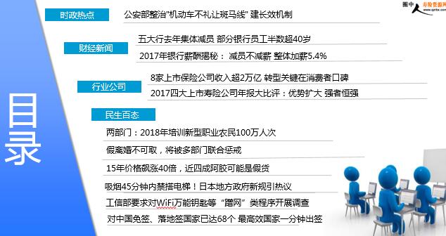 2018年4月4日 星期三 每日新闻速递 目录 时政热点 财经新闻 行业公司 民生百态 公安部整治"机动车不礼让斑马线" 建长效机制 五大行去年集体减员 部分银行员工半数超40岁 2017年银行薪酬揭秘: 减员不减薪 整体加薪5.4% 8家上市保险公司收入超2万亿 转型关键在消费者口碑 2017四大上市寿险公司年报大比评:优势扩大 强者恒强 两部门:2018年培训新型职业农民100万人次 假离婚不可取,将被多部门联合惩戒 15年价格飙涨40倍,近四成阿胶可能是假货 吸烟45分钟内禁搭电梯!日本地方政府新规引热议 工信部要求对WiFi万能钥匙等“蹭网”类程序开展调查 对中国免签、落地签国家已达68个 最高效国家一分钟出签 公安部整治"机动车不礼让斑马线" 建长效机制 2018-04-03 14:51 来源:中国青年网 斑马线是行人过街的安全线,机动车礼让斑马线是驾驶人的法定义务。可是长期以来,一些机动车行经斑马线时不减速、不停车,造成人车混杂、道路拥堵,严重的甚至会诱发道路交通事故。2017年4月,一场斑马线上的治理行动在全国铺开。记者了解到,一段时间以来,各地狠抓不懈、多措并举。在湖北武汉、湖南长沙,当地在重点路口设置非机动车临时学习点,组织违法行为人参加现场交通安全学习。在山东济南、河南郑州,一些流量大、违法多的路口路段均启用了人脸识别系统,记录交通违法行为并在现场大屏幕滚动曝光违法行为人的信息。 财经新闻 五大行去年集体减员 部分银行员工半数超40岁 2018-04-03 09:35:44 来源:澎湃新闻 随着中国银行年报全新出炉,五家国有银行2017年业绩全部披露。年报数据显示,五家国有银行员工在境内银行机构员工全部减少,其中工商银行、农业银行、建设银行减员都在8000人以上,中国银行仅内地商业银行机构员工减少96人,整体员工数量不降反增,交通银行境内银行机构从业人员减少了1259人。除此之外,在国有大行人员结构中,不少银行超过40岁年龄员工占比超过四成,农业银行41岁以上员工占比超过了63%,其中51岁及以上年龄的员工占比超过两成。