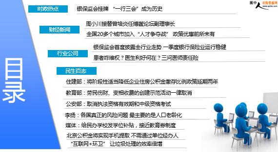 2018年4月10日 星期二 每日新闻速递 目录 时政热点 财经新闻 行业公司 民生百态 银保监会挂牌 “一行三会”成为历史 周小川接替曾培炎任博鳌论坛副理事长 全国20多个城市加入“人才争夺战” 政策优惠前所未有 银保监会首度披露全行业走势 一季度银行保险业运行稳健 患者咋维权?医生利好何在?三问医师责任险 住建部:将阶段性适当降低企业住房公积金缴存比例政策延期两年 教育部:劳民伤财、变相收费的创建示范活动一律取消 公安部:取消执法资格有效期和中级资格考试 李扬:各国真正的风险问题 最主要的是人口老龄化 媒体:给民办学校发学位补贴,接近教育券制度 北京公积金将实现手机提取 不需通过单位经办人 “互联网+环卫” 让垃圾处理的效率倍增 银保监会挂牌 “一行三会”成为历史 2018-04-09 00:29:06 来源:北京商报 4月8日上午,中国银行保险监督管理委员会(以下简称“银保监会”) 在北京金融街的鑫茂大厦南楼正式挂牌,银保监会新牌匾的悬挂,也意味着一个新的监管时代即将到来。国务院副总理刘鹤在揭牌仪式上指出,金融监管体制改革是整个机构改革的重要组成部分,对解决金融监管交叉和监管空白,逐步建立现代金融监管框架,打好防范化解金融风险攻坚战,具有重大意义和深远影响。 财经新闻 周小川接替曾培炎任博鳌论坛副理事长 2018-04-09 11:25 来源: 中国青年网 4月9日上午,根据会员大会选举结果,博鳌亚洲论坛产生新一届理事会。在随后召开的新一届理事会会议上,第8任联合国秘书长潘基文当选理事长,中国外交部副部长李保东被任命为秘书长。中国人民银行前行长周小川出任博鳌亚洲论坛中方首席代表。根据章程规定,中方首席代表为理事会担任理事,并担任副理事长。这一任命在4月9日,博鳌亚洲论坛新一届理事会会议上正式公布。