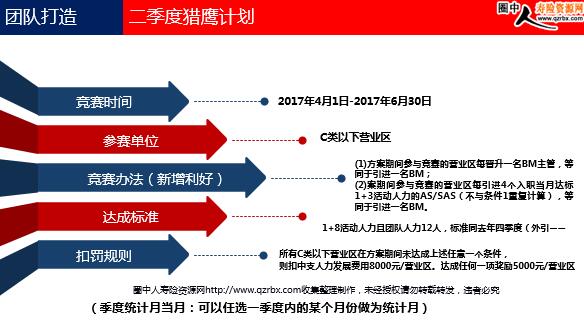 人力发展部五月工作规划报告 五月增员主题——寻找创富合伙人 4.26-4.27 MDC检视启动(内勤) 3月9-10日主任月训四个基本切分增员主体启动、训练 5月11-15日五日增员运作 12日全省外勤检视、启动视频 13-14日全省营业区同步创说会(100%) 5月16-18日 MDC体验班 5月19-5月24日新人备战 一触即发 23-24日一季度鸿鹄论道 5月25日五月新增集中上岗 4-5月新增目标达成 5月1-8日增员主体深度面谈 5.3倚天现场会(分公司) 5.3-4人力发展负责人现场会 7-8日向阳班 MDC新增集中上岗操作 方案对象:MDC项目增员主体奖励前提:二季度连续阳光人力/合格奖励标准: 方案说明: 1、新增人员指:4月1日-5月31日前上岗所有职级人员,外引主管本人不享受方案; 2、合格标准:寿险FYP≥3000元且件数≥1件;阳光人力标准:寿险FYC ≥1600C,件数≥2; 3、新人每月出勤≥12天,方可获得当月奖励; 4、单个新人奖励推荐人费用上限2万,总额不封顶;离职人员不计入方案; 5、严禁虚假人力及挂单行为,随机抽查+大单回访,一经发现取消推荐人方案资格; 6、2017年4月和5月月均主管增员活动率38%。 1-5月连续达成伯乐将星(前置达成),入围分公司半年峰会,参与表彰 前30名参加旅游(xx) 如排名相等,按照新增合格人次/新人标保多少排序; 如与营销高峰会同时入围,可参与表彰,旅游不兼得 首届双峰会组织发展会长:新增首合第一人 2017年4月1日-2017年6月30日 C类以下营业区 方案期间参与竞赛的营业区每晋升一名BM主管,等同于引进一名BM;案期间参与竞赛的营业区每引进4个入职当月达标1+3活动人力的AS/SAS(不与条件1重复计算),等同于引进一名BM。