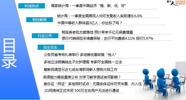2018年4月18日 星期三 每日新闻速递 目录 时政热点 财经新闻 行业公司 民生百态 国家统计局:一季度中国经济“稳、新、优、好” 统计局:一季度全国居民人均可支配收入实际增长6.6% 中国中等收入群体超3亿人,你达标了吗? 税延养老险方案落地 预计带来千亿元保费增量 银行代销保险手续费探秘:农行平均费率4.11% 招行5.97% 公务员省考将扎堆举行 多地推优惠政策“抢人” 多地立法明确独生子女护理假 专家吁全国统一立法 最新民调显示近七成台湾职场新人想到大陆工作 英语能力等级量表公布 对学习教学测试有何影响? 身份证“网证”多地同时试点:无需实体证件可买车票、办入住 2G网络将正式关闭 500万左右用户无法进行通话 时政热点 国家统计局:一季度中国经济“稳、新、优、好” 2018年04月17日 07:34 来源:中国新闻网 国新办今天上午举行新闻发布会,请国家统计局国民经济综合统计司司长、新闻发言人邢志宏介绍2018年一季度国民经济运行情况,并答记者问。有记者问,从国家统计局公布的数据看,一季度的经济运行平稳,怎么全面去评价我国一季度国民经济的运行情况?又如何理解开局良好?邢志宏表示,今年一季度我国经济发展稳中有进、进中育新,国民经济延续了稳中向好的态势,转型升级深入推进、质量效益持续提升,经济发展开局良好。一季度经济运行的特点,我想用“稳、新、优、好”四个字来概括。 财经新闻 统计局:一季度全国居民人均可支配收入实际增长6.6% 2018-04-17 10:38 来源:国家统计局网站 2018年一季度,全国居民人均可支配收入7815元,比上年同期名义增长8.8%,扣除价格因素,实际增长6.6%。其中,城镇居民人均可支配收入10781元,增长(以下如无特别说明,均为同比名义增长)8.0%,扣除价格因素,实际增长5.7%;农村居民人均可支配收入4226元,增长8.9%,扣除价格因素,实际增长6.8%。一季度,全国居民人均可支配收入中位数6580元,增长8.5%,中位数是平均数的84.2%。其中,城镇居民人均可支配收入中位数9275元,增长6.6%,是平均数的86.0%;农村居民人均可支配收入中位数3363元,增长9.9%,是平均数的79.6%。