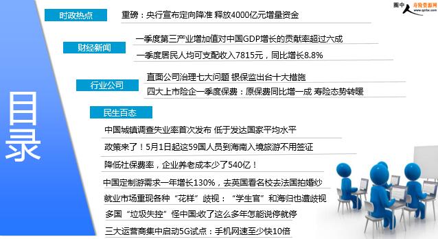 2018年4月19日 星期四 每日新闻速递 目录 时政热点 财经新闻 行业公司 民生百态 重磅:央行宣布定向降准 释放4000亿元增量资金 一季度第三产业增加值对中国GDP增长的贡献率超过六成 一季度居民人均可支配收入7815元,同比增长8.8% 直面公司治理七大问题 银保监出台十大措施 四大上市险企一季度保费:原保费同比增一成 寿险态势转暖 中国城镇调查失业率首次发布 低于发达国家平均水平 政策来了!5月1日起这59国人员到海南入境旅游不用签证 降低社保费率,企业养老成本少了540亿! 中国定制游需求一年增长130%,去英国看名校去法国拍婚纱 就业市场重现各种“花样”歧视:“学生官”和海归也遭歧视 多国“垃圾失控”怪中国:收了这么多年怎能说停就停 三大运营商集中启动5G试点:手机网速至少快10倍 时政热点 重磅:央行宣布定向降准 释放4000亿元增量资金 2018-04-17 18:51:37 来源:央行网站 4月17日消息,央行晚间发布公告,从2018年4月25日起,下调大型商业银行、股份制商业银行、城市商业银行、非县域农村商业银行、外资银行人民币存款准备金率1个百分点。中国人民银行有关负责人表示,央行此举一是可以增加长期资金供应,降低企业融资成本。二是释放4000亿元增量资金,增加了小微企业贷款的低成本资金来源。 财经新闻 一季度第三产业增加值对中国GDP增长的贡献率超过六成 2018年04月18日 07:34 来源:中国新闻网 国家统计局17日公布的数据显示,一季度全国新登记企业超过132万户,同比增长超过5%,日均新登记企业1.47万户;工业战略性新兴产业增加值同比增长近一成,绿色发展稳步推进,一季度单位国内生产总值能耗同比下降3.2%。中国经济新动能快速成长。数据显示,一季度全国居民人均可支配收入超过7800元,同比名义扣除价格因素实际增长6.6%。按常住地分,城镇居民人均可支配收入超过一万元,农村居民人均可支配收入超过4千元,城乡居民人均收入倍差2.55,比上年同期缩小0.02。
