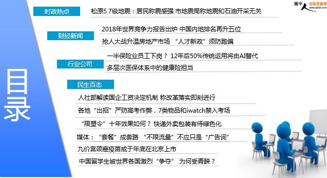 每日新闻速递 2018年5月29日 星期二 目录 时政热点 财经新闻 行业公司 民生百态 松原5.7级地震:居民称震感强 市地震局称地震和石油开采无关 2018年世界竞争力报告出炉 中国内地排名再升五位 抢人大战升温房地产市场 “人才新政”须防跑偏 一半保险业员工下岗? 12年后50%传统运用将由AI替代 多层次医保体系中的健康险担当 人社部解读国企工资决定机制 称改革落实即刻进行 各地“出招”严防高考作弊,7类物品和iwatch禁入考场 “限塑令”十年效果如何? 快递外卖包装有待绿色化 媒体:“套餐”成套路 “不限流量”不应只是“广告词” 九价宫颈癌疫苗或于年底在北京上市 中国留学生被世界各国激烈“争夺” 为何受青睐? 时政热点 松原5.7级地震:居民称震感强 市地震局称地震和石油开采无关 2018-05-28 08:08 来源:澎湃新闻 据中国地震台网消息,5月28日1时50分在吉林松原市宁江区发生5.7级地震,震源深度13千米,震中位于北纬45.27度,东经124.71度。据松原市地震局官方微博@松原市地震局 此前发布的消息,本次地震的震中位于松原市宁江区毛都站镇附近(东经124.71度、北纬45.27度),震源深度13千米。目前,未有房屋破损和人员伤亡报告,正在进一步核实中。5月28日上午,松原市地震局办公室工作人员告诉澎湃新闻,该局已派工作人员到毛都站镇,相关情况正在了解核实中。 财经新闻 2018年世界竞争力报告出炉 中国内地排名再升五位 2018-05-27 12:32 来源:凤凰网 日前,瑞士洛桑国际管理学院(IMD)发布了《2018年世界竞争力报告》(以下简称《报告》),《报告》显示美国排名第一,中国内地得分89.028,排名较去年上升5位,至第13位,上升幅度在众多经济体中表现突出。《报告》分析认为,中国内地经济竞争力显著提升,主要缘于两大指标改善:一是对硬件及软件基础设施投资加大;二是政府规章进一步简化,提升了营商效率。在近三年的排名中,中国内地从2016年的第25位升至2017年的第18位,再到2018年升至第13位。