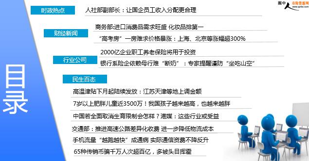 每日新闻速递 2018年5月30日 星期三 目录 时政热点 财经新闻 行业公司 民生百态 人社部副部长:让国企员工收入分配更合理 商务部:进口消费品需求旺盛 化妆品排第一 “高考房”一房难求价格暴涨:上海、北京等涨幅超300% 2000亿企业职工养老保险将用于投资 银行系险企依赖母行难“断奶”:专家提醒谨防“坐吃山空” 高温津贴下月起陆续发放:江苏天津等地上调金额 7岁以上肥胖儿童近3500万!我国孩子越来越高,也越来越胖 中国若全面取消生育限制会怎样?港媒:这些行业或受益 交通部:推进高速公路差异化收费 进一步降低物流成本 手机流量“越跑越快”成通病 实际通信资费不降反升 65种传销币骗千万人次超百亿,多被头目挥霍 时政热点 人社部副部长:让国企员工收入分配更合理 2018-05-29 05:51 来源:光明日报 日前,国务院印发《关于改革国有企业工资决定机制的意见》,旨在进一步建立健全灵活、高效的国有企业经营机制,推动国有企业全面提升发展质量和效率。《意见》明确,此次改革要遵循四项基本原则:坚持建立中国特色现代国有企业制度改革方向,坚持效益导向与维护公平相统一,坚持市场决定与政府监管相结合,坚持分类分级管理。具体思路是,以国有企业工资总额分配为重点,兼顾国有企业内部分配,坚持问题导向和目标导向,按照工资分配市场化改革方向,改革企业工资总额确定办法和管理方式,进一步落实企业工资分配自主权。同时,改进和加强政府对企业工资分配的监管,强化事前引导和事中事后监督。 财经新闻 商务部:进口消费品需求旺盛 化妆品排第一 2018-05-29 06:41 来源:中国经济网 5月28日,商务部发布的《主要消费品供需状况统计调查分析报告》显示,消费者对进口商品的需求旺盛,进口商品成为市场供给重要补充。不过,企业增加进口意愿在品类之间差异较大。调查分析报告显示,随着收入水平的提高,消费者对进口优质商品消费意愿不断增强,家庭月收入超过2万元的消费者都购买过进口商品,且最近一年内已经或有意购买进口商品的占比高达 86.6%。消费者对食品、服装鞋帽和化妆用品的关注度较高;化妆用品、母婴用品和钟表眼镜等大类中进口商品比重较高,未来半年内增加购买的意愿也较强。消费者购买进口商品时,主要关心安全、价格和品质。