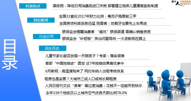 每日新闻速递 2018年6月1日 星期五 目录 时政热点 财经新闻 行业公司 民生百态 国务院:降低日用消费品进口关税 部署建立残疾儿童康复救助制度 全国31省份2017年财力比拼:粤苏沪高居前三甲 全国房贷利率涨势迅猛 刚需者:咬着牙也要先上车再说 银保监会提醒消费者 “避坑”银保渠道 需确认销售资质 银保监会“补短板”突出问题导向 一大波新规在路上 儿童节家长能否放假一天陪孩子?专家:落实很难 首部“中国控烟史”面世 近7年控烟效果喜忧参半 6月新规:高温津贴来了 网约车纳入出租考核体系 租房也是安居?大城市三成人口或将长期租房 人民日报刊文谈“凑单”等过度消费:花钱不一定能买到快乐 去年338个地级及以上城市空气优良天数比例78.0% 时政热点 国务院:降低日用消费品进口关税 部署建立残疾儿童康复救助制度 2018年05月31日 01:21 来源:北京晨报 国务院总理李克强5月30日主持召开国务院常务会议,确定进一步积极有效利用外资的措施,推动扩大开放促进经济升级;决定较大范围下调日用消费品进口关税,更好满足群众多样化消费需求;部署建立残疾儿童康复救助制度,给他们更多帮扶和关爱。会议指出,要按照党中央、国务院部署,营造更加公平、透明、便利的外商投资环境,推动形成全面开放新格局,努力保持我国作为全球外商投资主要目的地地位。 财经新闻 全国31省份2017年财力比拼:粤苏沪高居前三甲 2018-05-31 09:31 来源:中新经纬 财政收入,是一个行政区域硬实力的体现,决定着这个区域在城市建设、民生支出等方面的投入,而一般公共预算收入则是财政收入重要的组成部分。根据各地2017年预算执行报告统计,广东、江苏、上海三地的一般公共预算收入位居前三甲,广东省更是高达1.31多万亿元;增速上,山西、西藏、内蒙古增长较快,吉林、天津出现负增长;财政自给率方面,东高西低的态势十分明显。