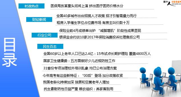 每日新闻速递 2018年6月5日 星期二 目录 时政热点 财经新闻 行业公司 民生百态 医保局改革重头戏将上演 挤出医疗医药价格水分 全国40多城市出台招揽人才政策 招才引智需量力而行 租房入学催生学位占位费市场 有房主叫价数十万 保险业前4月成绩单出炉 “减脂增肌”阶段性成果显现 银保监会约谈10家2017年保险消费投诉处理靠后公司 全国60岁以上老年人口已达2.4亿:15市试点长期护理险 覆盖4800万人 国家卫生健康委:五方面做好少儿近视防控工作 31省份专项治理校外培训乱象 均已公布治理方案 今年高考有这些新特征:“00后”登场 加分政策收紧 我国老龄化持续加深 独居和空巢老年人增加 抗生素耐药性日益严重 粮农组织:养家畜别用 时政热点 医保局改革重头戏将上演 挤出医疗医药价格水分 2018-06-04 09:26 来源:经济参考报 “三医”联动成为国家深化医改的核心,而新组建的国家医疗保障局被寄予厚望。《经济参考报》记者获悉,为完善医保制度,统筹推进“三医”联动,国家医保局未来或将围绕治理机制、治理体系和治理结构的完善,开启多场改革重头戏,包括重点推进制度整合,健全基本医保筹资和待遇调整机制,完善医保基金区域平衡调剂机制,加快实施医保支付标准,挤出医疗医药价格水分等。 财经新闻 全国40多城市出台招揽人才政策 招才引智需量力而行 2018-06-04 09:01 来源:经济参考报 自去年2月份以来,已有40多座城市先后出台招揽人才政策,当前,各地竞相出台吸引人才政策,有利于各地经济迈向高质量,产业迈向中高端,有一定的合理性。但也要注意,招才引智一定要尊重规律,结合实际,不能盲目效仿,不顾当地产业发展需求、公共资源承载能力,更不能把引人政策与房地产调控相捆绑——最近一个时期,很多城市密集出台了一些引人引智重大举措,引发社会各界广泛关注。