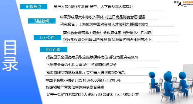 每日新闻速递 2018年6月7日 星期四 目录 时政热点 财经新闻 行业公司 民生百态 高考人数创近8年新高 高中、大学普及率大幅提升 中国形成最大中等收入群体 对进口商品消费意愿增强 研究报告:上海成为中国对金融人才吸引力最强的城市 商业养老险落地:健全社会保障体系 提升退休生活品质 银行系保险公司转型路漫漫 银保渠道代销占比居高不下 报告显示全国高考录取率继续保持高位 部分地区突破90% 下半年会有这七件大事发生 将影响你钱袋子 我国面临空前隐私危机:去年每人被泄露5次信息 中国电商就业强劲升温 打造4000余万工作机会 旅游领域严重失信主体将受联合惩戒 辽宁一铁矿炸药爆炸25人被困:23名被困工人已成功升井 时政热点 高考人数创近8年新高 高中、大学普及率大幅提升 2018-06-06 08:57 来源:央视新闻 数据显示,中国高考人数一直在持续变化。上个世纪八十年代,报名人数一度每年只有100多万人。高考人数顶峰时期是2008年,为1050万,到2013年下降到912万,2014、2015年分别增加到939万、942万,2016、2017年稳定为940万。2018年,这一数据为975万,比上一年增加35万,这是2010年以来的高考人数最多的一年。但是,事实上适龄上大学的学生人数并未增加。国家统计局数据显示,中国出生率整体呈现下降的态势。1987年为23.33‰,到了2004年只有12.29‰,降幅达到了一半。此后尽管有波动,但是整体稳定在12‰左右,2017年全国人口出生率为12.43‰。 财经新闻 中国形成最大中等收入群体 对进口商品消费意愿增强 2018-06-06 06:05 来源:人民日报 国务院关税税则委员会上周发布公告,决定自2018年7月1日起,降低部分日用消费品的最惠国税率。此次降税商品涵盖食品、服装鞋帽、家具用品、日杂百货、文体娱乐、家用电子、日化用品、医药健康等8类日用消费品,涉及1449个税目,占到《进出口税则》中消费品税目总数的七成。——家庭月收入超过2万元的消费者,最近一年内已经或有意购买进口商品的占比高达86.6%
