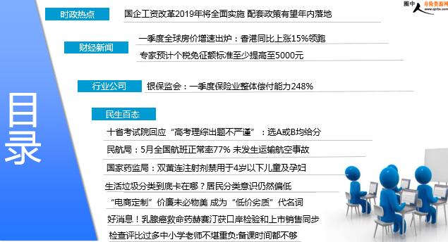 每日新闻速递 2018年6月13日 星期三 目录 时政热点 财经新闻 行业公司 民生百态 国企工资改革2019年将全面实施 配套政策有望年内落地 一季度全球房价增速出炉:香港同比上涨15%领跑 专家预计个税免征额标准至少提高至5000元 银保监会:一季度保险业整体偿付能力248% 十省考试院回应“高考理综出题不严谨”:选A或B均给分 民航局:5月全国航班正常率77% 未发生运输航空事故 国家药监局:双黄连注射剂禁用于4岁以下儿童及孕妇 生活垃圾分类到底卡在哪?居民分类意识仍然偏低 “电商定制”价廉未必物美 成为“低价劣质”代名词 好消息!乳腺癌救命药赫赛汀获口岸检验和上市销售同步 检查评比过多中小学老师不堪重负:备课时间都不够 时政热点 国企工资改革2019年将全面实施 配套政策有望年内落地 2018-06-12 06:08 来源:经济参考报 国企工资改革将在明年全面实施。《经济参考报》记者6月11日获悉,近日人力资源和社会保障部、财政部、国务院国资委联合召开贯彻落实《关于改革国有企业工资决定机制的意见》电视电话会。人力资源社会保障部副部长邱小平要求,各地区、各部门要切实加强组织领导,抓紧制定配套政策,推进改革顺利进行,确保明年全面实施。强化督促指导,注意研究解决实施中遇到的新情况、新问题。国务院国资委副主任徐福顺此前表示,根据相关要求,国资委将在2018年适时出台中央企业工资总额管理办法,配套研究制定实施细则等操作性文件。 财经新闻 一季度全球房价增速出炉:香港同比上涨15%领跑 2018-06-12 09:20 来源:人民日报 据华尔街日报中文网消息,莱坊国际全球房价指数显示,截至今年3月,香港房价同比上涨15%,高踞全球各大住宅市场之首。报道称,尽管香港政府已出台楼市降温措施,包括提高外国买家的征税,整体住宅价格仍持续快速上涨,并且时常出现一些刷新世界纪录的天价房屋交易。据悉,从2008年莱坊国际推出该项指数以来,香港已有10次问鼎榜首。报道表示,在过去的一年里,地中海岛国马耳他和“避税天堂”泽西岛也面临住房短缺的问题,导致房价同比涨幅双双突破两位数。以要价为衡量标准,第一季度马耳他的住宅价格同比上涨13.6%,位居榜单第二;泽西岛以12.1%的同比涨幅位列第五名。