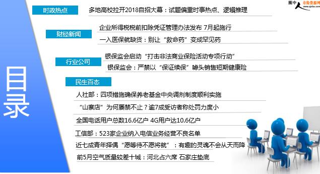 每日新闻速递 2018年6月14日 星期四 目录 时政热点 财经新闻 行业公司 民生百态 多地高校拉开2018自招大幕:试题偏重时事热点、逻辑推理 企业所得税税前扣除凭证管理办法发布 7月起施行 一入医保就缺货:别让“救命药”变成罕见药 银保监会启动“打击非法商业保险活动专项行动” 银保监会:严禁以“保证续保”噱头销售短期健康险 人社部:四项措施确保养老基金中央调剂制度顺利实施 “山寨店”为何屡禁不止?逾7成受访者称处罚力度小 全国电话用户总数16.6亿户 4G用户达10.6亿户 工信部:523家企业纳入电信业务经营不良名单 近七成青年择偶“愿等待不愿将就”:有趣的灵魂不会从天而降 前5月空气质量较差十城:河北占六席 石家庄垫底 时政热点 多地高校拉开2018自招大幕:试题偏重时事热点、逻辑推理 2018-06-13 10:11 来源:澎湃新闻 报道,对于绝大多数高考生而言,今年的高考任务已经完成。但对于部分考生来说,高考的“第二战场”才刚刚开辟——高校自主招生考试。如果能通过这些高校根据自己的需求组织的自主考试,即使高考成绩没有达到录取线,也已经跟高校“确认过眼神”,作为“对的人”能获得一定的录取分数优惠,从而顺利进入心仪的高校。所以有不少考生不把自主招生叫“第二战场”,而叫“复活赛”。 财经新闻 2018年06月13日 12:47 来源:中国新闻网 近日,国家税务总局发布了《企业所得税税前扣除凭证管理办法》(以下简称《办法》),《办法》自2018年7月1日起施行。13日,税务总局在官网发布了相关解读,解读称,税前扣除凭证种类多、源头广、情形多,《办法》从统一认识、易于判断、利于操作出发,对税前扣除凭证的相关概念、适用范围、管理原则、种类、基本情形税务处理、特殊情形税务处理等予以明确。与此同时,《办法》始终贯穿了“放管结合,优化服务”的理念,对于深入贯彻税务系统“放管服”改革精神将起到积极促进作用。。