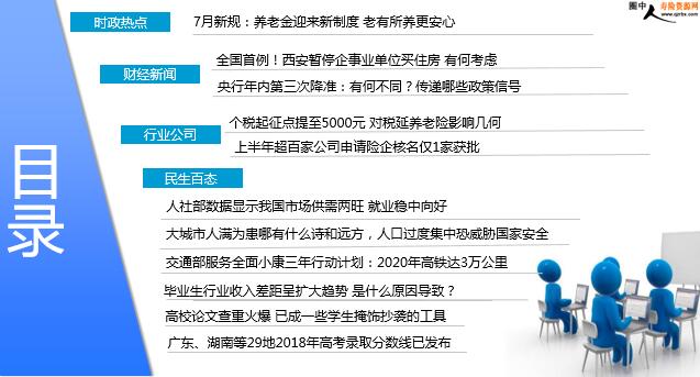 每日新闻速递 2018年6月26日 星期二 目录 时政热点 财经新闻 行业公司 民生百态 7月新规:养老金迎来新制度 老有所养更安心 全国首例!西安暂停企事业单位买住房 有何考虑 央行年内第三次降准:有何不同?传递哪些政策信号 个税起征点提至5000元 对税延养老险影响几何 上半年超百家公司申请险企核名仅1家获批 人社部数据显示我国市场供需两旺 就业稳中向好 大城市人满为患哪有什么诗和远方,人口过度集中恐威胁国家安全 交通部服务全面小康三年行动计划:2020年高铁达3万公里 毕业生行业收入差距呈扩大趋势 是什么原因导致? 高校论文查重火爆 已成一些学生掩饰抄袭的工具 广东、湖南等29地2018年高考录取分数线已发布 时政热点 7月新规:养老金迎来新制度 老有所养更安心 2018-06-25 07:16 来源:人民网 6月13日,国务院正式发布《关于建立企业职工基本养老保险基金中央调剂制度的通知》。《通知》明确,7月1日起正式实施养老保险基金中央调剂制度。人力资源和社会保障部副部长游钧表示,中央调剂基金是由各省的养老保险基金上解的资金构成的。作为企业和职工个人的缴费仍然按照现行政策执行,不需要额外多缴费。全国养老保险基金当期收支总量并没有发生任何变化,不会增加社会整体负担、不会提高养老保险缴费比例。建立基金中央调剂制度以后不改变现行的养老保险待遇的计发办法和调整办法,所以它不会影响退休人员的个人待遇,通过建立基金中央调剂制度能够增加养老保险制度的整体抗风险能力,各地的养老金按时足额发放就更有保障。 财经新闻 全国首例!西安暂停企事业单位买住房 有何考虑 2018-06-25 01:04:00 来源:中国新闻网 西安近日发布楼市新政,限购区域内,暂停向企事业单位及其他机构销售住房。业内专家分析称,此乃全国首例,这一政策或将被多个城市借鉴。6月24日,西安市政府办公厅发布《关于进一步规范商品住房交易秩序有关问题的通知》。《通知》中很核心的内容是,在住房限购区域范围内,暂停向企事业单位及其他机构销售住房(含商品住房和二手住房)。关于暂停企事业单位购买住房的原因,西安市房管局负责人表示,这是为了“防止以企业名义投机炒房”。