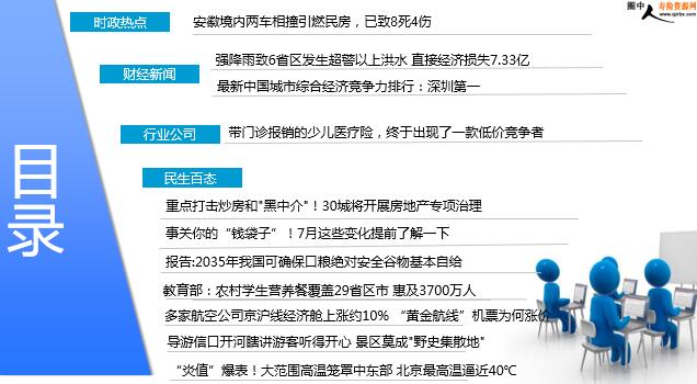 每日新闻速递 2018年6月29日 星期五 目录 时政热点 财经新闻 行业公司 民生百态 安徽境内两车相撞引燃民房,已致8死4伤 强降雨致6省区发生超警以上洪水 直接经济损失7.33亿 最新中国城市综合经济竞争力排行:深圳第一 带门诊报销的少儿医疗险,终于出现了一款低价竞争者 重点打击炒房和"黑中介"!30城将开展房地产专项治理 事关你的“钱袋子”!7月这些变化提前了解一下 报告:2035年我国可确保口粮绝对安全谷物基本自给 教育部:农村学生营养餐覆盖29省区市 惠及3700万人 多家航空公司京沪线经济舱上涨约10% “黄金航线”机票为何涨价 导游信口开河瞎讲游客听得开心 景区莫成"野史集散地" “炎值”爆表!大范围高温笼罩中东部 北京最高温逼近40℃ 时政热点 安徽境内两车相撞引燃民房,已致8死4伤 2018年06月28日 09:40:39 来源:人民网 6月28日凌晨2时许,S102线颍上县境内100KM+700M处发生一起两货车追尾相撞事故,其中一辆油罐车汽油泄露起火,引燃车辆及路边民房。火灾已造成现场2人、民房内6人共8人死亡,4人受伤。 财经新闻 强降雨致6省区发生超警以上洪水 直接经济损失7.33亿 2018-06-27 21:40 来源:中国新闻网 近期强降雨致6省区31条河流发生超警以上洪水。截至6月27日12时统计,此次降雨过程造成四川、山东2省48个县(市、区)遭受洪涝灾害,农作物受灾面积8.36千公顷,受灾人口25.43万人,紧急转移1.5万人,倒塌房屋46间,直接经济损失约7.33亿元,无死亡失踪人员报告。