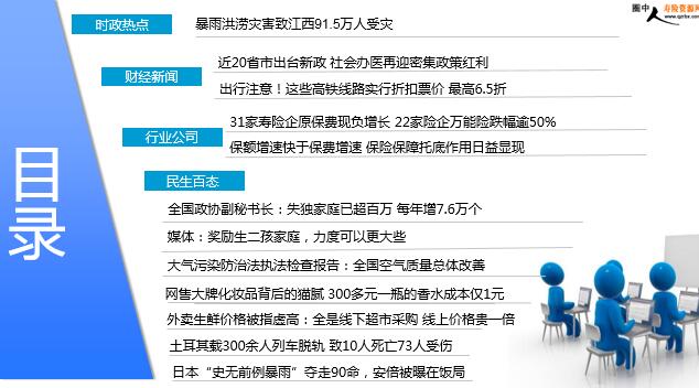 每日新闻速递 2018年7月10日 星期二 目录 时政热点 财经新闻 行业公司 民生百态 暴雨洪涝灾害致江西91.5万人受灾 近20省市出台新政 社会办医再迎密集政策红利 出行注意!这些高铁线路实行折扣票价 最高6.5折 31家寿险企原保费现负增长 22家险企万能险跌幅逾50% 保额增速快于保费增速 保险保障托底作用日益显现 全国政协副秘书长:失独家庭已超百万 每年增7.6万个 媒体:奖励生二孩家庭,力度可以更大些 大气污染防治法执法检查报告:全国空气质量总体改善 网售大牌化妆品背后的猫腻 300多元一瓶的香水成本仅1元 外卖生鲜价格被指虚高:全是线下超市采购 线上价格贵一倍 土耳其载300余人列车脱轨 致10人死亡73人受伤 日本“史无前例暴雨”夺走90命,安倍被曝在饭局 时政热点 暴雨洪涝灾害致江西91.5万人受灾 2018-07-09 07:07 来源: 09:54 人民日报 记者从应急管理部获悉:7月8日国家减灾委、应急管理部针对江西省南昌、景德镇、九江等地近期严重暴雨洪涝灾害,紧急启动国家Ⅳ级救灾应急响应,派出工作组赶赴灾区,查看灾情,指导地方开展救灾工作。据江西省民政厅报告:截至7月7日18时统计,7月5日以来的严重暴雨洪涝灾害已造成南昌、景德镇、九江、鹰潭、赣州、吉安、宜春、抚州、上饶9个设区市39县(市、区)共91.5万人受灾,直接经济损失10.1亿元。 财经新闻 近20省市出台新政 社会办医再迎密集政策红利 2018-07-09 07:09 来源:经济参考报 社会办医正迎来央地多重政策力挺。据《经济参考报》记者不完全统计,上半年已经有近20省市发布促社会办医新政,涵盖降低准入门槛、提高审批效率、提供财税和投融资支持等多项关键内容。在专家看来,社会办医步伐再提速,将为公立医院破除垄断以及医改的深入推进提供又一“强心剂”。我国社会办医正呈现蓬勃发展势头。国家统计局近日发布的《2017年国民经济和社会发展统计公报》显示,2017年年末全国共有医院3.0万个,其中公立医院1.2万个,民营医院1.8万个。相比2016年,公立医院数量减少了约1000家,而民营医院增长了2000家。