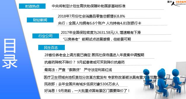 每日新闻速递 2018年8月15日 星期三 目录 时政热点 财经新闻 行业公司 民生百态 中央将制定计划生育扶助保障补助国家基础标准 2018年7月份社会消费品零售总额增长8.8% 央行:全国人均拥有6.6个账户 人均持有4.81张银行卡 2017年全国保险密度为2631.58元/人 增速略有下滑 “以房养老”前期试点进展缓慢,但前景可期 28省份养老金上调方案已确定 居民社保待遇进入年度集中调整期 抗癌药降税不降价? 9月起患者或可买到降价抗癌药 最高法:严查“套路贷” 严守法定利率红线 医疗卫生领域央地权责划分改革方案发布 专家称改革破冰具有重大示范意义 民政部:去年全国共有城乡低保对象5306万余人 好消息!9月底前,一大批重点国有景区门票要降价了! 时政热点 中央将制定计划生育扶助保障补助国家基础标准 2018-08-13 17:03 来源:海外网 国务院印发《医疗卫生领域中央与地方财政事权和支出责任划分改革方案》,方案提出,中央制定计划生育扶助保障补助国家基础标准,并根据经济社会发展情况逐步提高。中央财政参照上述基本公共卫生服务支出责任中央分档分担办法安排补助资金。近日,国务院办公厅印发《医疗卫生领域中央与地方财政事权和支出责任划分改革方案》(以下简称《方案》),自2019年1月1日起实施。 财经新闻 2018年7月份社会消费品零售总额增长8.8% 2018-08-14 06:33 来源:经济参考报 2018年7月份,社会消费品零售总额30734亿元,同比名义增长8.8%(扣除价格因素实际增长6.5%,以下除特殊说明外均为名义增长)。其中,限额以上单位消费品零售额11419亿元,增长5.7%。2018年1-7月份,社会消费品零售总额210752亿元,同比增长9.3%。其中,限额以上单位消费品零售额81125亿元,增长7.3%。