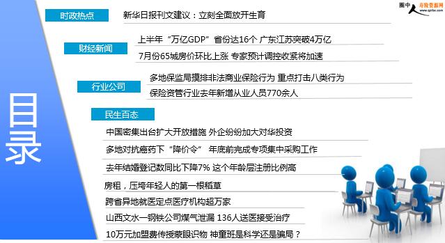 每日新闻速递 2018年8月17日 星期五 目录 时政热点 财经新闻 行业公司 民生百态 新华日报刊文建议:立刻全面放开生育 上半年“万亿GDP”省份达16个 广东江苏突破4万亿 7月份65城房价环比上涨 专家预计调控收紧将加速 多地保监局摸排非法商业保险行为 重点打击八类行为 保险资管行业去年新增从业人员770余人 中国密集出台扩大开放措施 外企纷纷加大对华投资 多地对抗癌药下“降价令” 年底前完成专项集中采购工作 去年结婚登记数同比下降7% 这个年龄层注册比例高 房租,压垮年轻人的第一根稻草 跨省异地就医定点医疗机构超万家 山西文水一钢铁公司煤气泄漏 136人送医接受治疗 10万元加盟费传授蒙眼识物 神童班是科学还是骗局? 时政热点 新华日报刊文建议:立刻全面放开生育 2018年08月16日 00:15:00 来源:澎湃新闻网 “国家统计局今年初公布,2017年中国大陆全年出生人口1723万,比上一年减少了63万,显示全面二孩政策导致的出生人口高峰很可能已经过去。这一观点从目前各地卫计委披露的人口出生情况中得到验证:2018年上半年的新生儿人数同比下降了约15%-20%。这意味着,2018年的出生人口比2017年还将有较大幅度的下降。更糟的是,按照2010年的普查数据,未来十年内我国的生育旺盛期妇女将减少约40%。在未来二三年内,随着我国第三次人口高峰期的育龄妇女逐渐退出育龄期,以及全面二孩政策实施导致的生育堆积效应释放结束,我国的人口出生率必然面临断崖式下跌。”上述文章指出,“少子化”的后果是十分严重的,提高生育率应成为新时代中国人口发展面临的新任务。 财经新闻 上半年“万亿GDP”省份达16个 广东江苏突破4万亿 2018-08-16 04:47 来源:北京青年报 “不管从供给侧看,还是从需求侧看,中国经济持续平稳的基本面不会发生变化,转型升级和结构调整的向好态势也不会发生变化。”8月14日,国新办举行7月份国民经济运行情况发布会,国家统计局新闻发言人刘爱华诠释了她对下半年整个经济形势的看法。这场发布会前,各省份已陆续亮出“成绩单”。目前,31省(市、区)披露了上半年经济“成绩单”。北京青年报记者注意到,前三名是广东、江苏和山东,其中广东和江苏GDP突破4万亿大关。