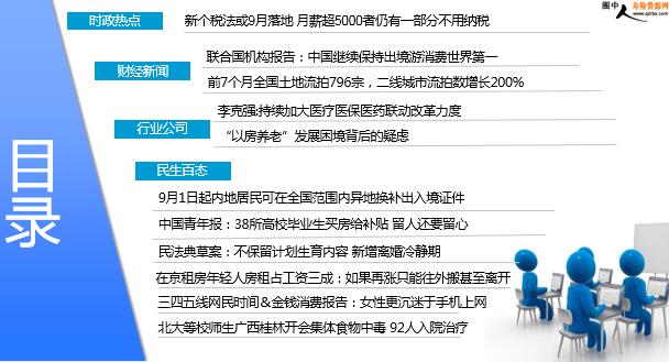 每日新闻速递 2018年8月29日 星期三 目录 时政热点 财经新闻 行业公司 民生百态 新个税法或9月落地 月薪超5000者仍有一部分不用纳税 联合国机构报告:中国继续保持出境游消费世界第一 前7个月全国土地流拍796宗,二线城市流拍数增长200% 李克强:持续加大医疗医保医药联动改革力度 “以房养老”发展困境背后的疑虑 9月1日起内地居民可在全国范围内异地换补出入境证件 中国青年报:38所高校毕业生买房给补贴 留人还要留心 民法典草案:不保留计划生育内容 新增离婚冷静期 在京租房年轻人房租占工资三成:如果再涨只能往外搬甚至离开 三四五线网民时间&金钱消费报告:女性更沉迷于手机上网 北大等校师生广西桂林开会集体食物中毒 92人入院治疗 时政热点 新个税法或9月落地 月薪超5000者仍有一部分不用纳税 2018-08-28 11:44 来源:华夏时报 尽管怀着“起征点会不会在最后关头上调”的想法的人不在少数,但二审中的个税法草案中的免征额(起征点)最终还是执行了原草案中5000元每月(6万每年)的方案。8月27日,个人所得税法修正草案提交十三届全国人大常委会第五次会议二次审议。与一审稿相比,二审方案在最受关注的起征点上没有改动,整部草案仅在专项扣除上增加了赡养老人专项附加扣除。不过,这并不意味着月薪超过5000元者均要纳税。 财经新闻 联合国机构报告:中国继续保持出境游消费世界第一 2018-08-28 13:18:50 来源证券时报 据统计,2017年世界旅游总收入为1.34万亿美元,比2016年增加了约940亿美元,中国游客的消费接近全球总收入的五分之一。2017年国际游客总数达到13.23亿人次,比上一年增加约8400万人次,增长7%,为2010年以来的最大增幅。2017年国际旅游收入增长了5%。除了1.34万亿美元旅游收入外,国际旅游中非居民进行的国际客运还带来2400亿美元收入,这使旅游业创造的出口额增加到1.58万亿美元,相当于每天40亿美元,占世界总出口额的7%。报告显示,在世界最大的旅游市场和目的地中,法国位居世界第一,西班牙上升为第二位,美国和中国分列第三、第四位;2017年欧洲和非洲的入境人数增速名列前茅,分别增长了8%和9%。