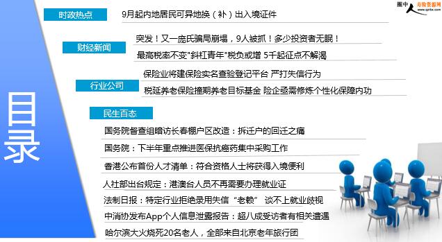每日新闻速递 2018年8月30日 星期四 目录 时政热点 财经新闻 行业公司 民生百态 9月起内地居民可异地换(补)出入境证件 突发!又一庞氏骗局崩塌,9人被抓!多少投资者无眠! 最高税率不变"斜杠青年"税负或增 5千起征点不解渴 保险业将建保险实名查验登记平台 严打失信行为 税延养老保险撞期养老目标基金 险企亟需修炼个性化保障内功 国务院督查组暗访长春棚户区改造:拆迁户的回迁之痛 国务院:下半年重点推进医保抗癌药集中采购工作 香港公布首份人才清单:符合资格人士将获得入境便利 人社部出台规定:港澳台人员不再需要办理就业证 法制日报:特定行业拒绝录用失信“老赖” 谈不上就业歧视 中消协发布App个人信息泄露报告:超八成受访者有相关遭遇 哈尔滨大火烧死20名老人,全部来自北京老年旅行团 时政热点 9月起内地居民可异地换(补)出入境证件 2018年08月28日 21:38 来源:澎湃新闻网 公安部28日在京召开新闻发布会,国家移民管理局出台22条改进服务管理的新举措,将于2019年一季度之前分期分批实施。其中,内地居民可在全国范围内异地申请换(补)发出入境证件、申办出入境证件7个工作日内办结等5项便利措施将于9月1日起实施。内地居民可在全国范围内异地申请换(补)发出入境证件、申办出入境证件7个工作日内办结等5项便利措施将于9月1日起实施。 财经新闻 突发!又一庞氏骗局崩塌,9人被抓!多少投资者无眠! 2018-08-28 17:42:41 来源: 钢铁王国 退潮之后,才知道谁在裸泳!刚刚,有媒体爆料:号称中国健身第一APP——健康猫,突然爆雷了!8月27日,广州公安发布通报:健康猫涉嫌非法吸收公众存款,已被立案调查,包括公司法人代表杨某在内,9人被抓。