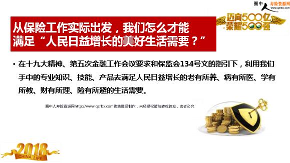 展望两乡新动态 把脉保险最前沿 课程大纲 一、拥抱新时代,两乡发展提出新要求二、把握新动能,两乡再遇发展黄金期三、紧抓新机遇,两乡再创历史新辉煌 十九大:新时代提出新要求! 习近平总书记说:“中国特色社会主义进入了新时代,意味着近代以来久经磨难的中华民族迎来了从站起来、富起来到强起来的伟大飞跃,迎来了实现中华民族伟大复兴的光明前景”,“我国社会主要矛盾已经转化为人民日益增长的美好生活需要和不平衡不充分的发展之间的矛盾”。 一、拥抱新时代 两乡发展提出新要求 第一个100年目标 2016年9月30日晚的国庆招待会上,李克强总理:六十七年来特别是改革开放以来,中国共产党带领全国各族人民百折不挠,砥砺奋进,伟大祖国实现了从积贫积弱到世界第二大经济体的转变,中华民族实现了从饱受欺凌到迈向伟大复兴的转变,人民生活实现了从缺衣少食到推进全面建成小康社会的转变。中国用71年的时间,走过从缺衣少食-温饱-小康的发展之路。到2020年只有短短两年多了。所以,十九大提出“决胜全面建成小康社会”的号召。 第二个100年目标: 第二个100年目标:中国用再用29年的时间,走过从小康向现代化强国的发展之路第一阶段,到2020年,十九大提出“决胜全面建成小康社会”的号召第二阶段,从2035年到本世纪中叶,基本实现现代化。第二阶段再奋斗15年,把我国建成富强民主文明和谐美丽的社会主义现代化强国。 什么是“人民日益增长的美好生活需要?” 现阶段(2020年之前)完成党的十七大报告中提出的,要努力使全体人民“学有所教、劳有所得、病有所医、老有所养、住有所居”。这是第一个“一百年”要实现的“美好生活”目标。 从保险工作实际出发,我们怎么才能 满足“人民日益增长的美好生活需要?” 在十九大精神、第五次金融工作会议要求和保监会134号文的指引下,利用我们手中的专业知识、技能、产品去满足人民日益增长的老有所养、病有所医、学有所教、财有所理、险有所避的生活需要。