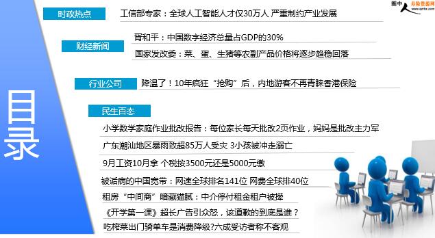 每日新闻速递 2018年9月3日 星期一 目录 时政热点 财经新闻 行业公司 民生百态 工信部专家:全球人工智能人才仅30万人 严重制约产业发展 胥和平:中国数字经济总量占GDP的30% 国家发改委:菜、蛋、生猪等农副产品价格将逐步趋稳回落 降温了!10年疯狂“抢购”后,内地游客不再青睐香港保险 小学数学家庭作业批改报告:每位家长每天批改2页作业,妈妈是批改主力军 广东潮汕地区暴雨致超85万人受灾 3小孩被冲走溺亡 9月工资10月拿 个税按3500元还是5000元缴 被诟病的中国宽带:网速全球排名141位 网费全球排40位 租房“中间商”暗藏猫腻:中介停付租金租户被撵 《开学第一课》超长广告引众怒,该道歉的到底是谁? 吃榨菜出门骑单车是消费降级?六成受访者称不客观 时政热点 工信部专家:全球人工智能人才仅30万人 严重制约产业发展 2018-09-01 15:26 来源:中国新闻网 “2018中国500强企业高峰论坛”于9月1-2日在西安举行,论坛由中国企业联合会、中国企业家协会主办,陕西省人民政府承办,西安市人民政府协办。工业和信息化部人才交流中心党委副书记陈新出席并演讲。其表示截止到2017年6月,全球人工智能人才仅30万人,严重制约我们产业的发展。他认为,目前数字经济领域面临着严峻的人才短缺问题,主要表现在几个方面:一是高层次的数字技术人才供不应求;二是具备数字技术与产业经验的跨界人才严重短缺;三是初级数字技能人才的培养也跟不上需求的增长。 财经新闻 胥和平:中国数字经济总量占GDP的30% 2018年09月02日 11:16 来源:财联社 从现实来看,我们在整个数字经济的发展上,中国这么多年已经取得了很好的进展,中国数字经济总量现在已经到27万亿,大体占GDP的30%左右,占GDP增量60%多,这是非常具有增长潜能的,所以现在摆在企业面前非常重要的话题,要紧紧抓住这一波数字经济发展的重大机遇。我看有些专家讲的比较大,把每一次世界经济发展模式,每一次世界经济转型重要动力来比较,把它放在资本、技术来考虑,现在就是围绕新产业,重构产业体系、重新定义企业,甚至重构企业组织构架,所以我们讲新的发展,互联网经济新的发展,大数据经济新的发展,可能在向深度渗透。
