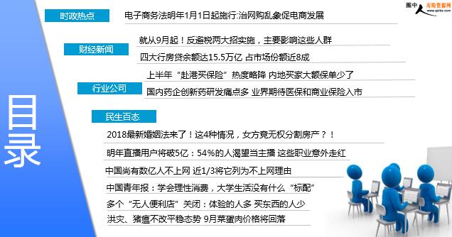 每日新闻速递 2018年9月5日 星期二 目录 时政热点 财经新闻 行业公司 民生百态 电子商务法明年1月1日起施行:治网购乱象促电商发展 就从9月起!反避税两大招实施,主要影响这些人群 四大行房贷余额达15.5万亿 占市场份额近8成 上半年“赴港买保险”热度略降 内地买家大额保单少了 国内药企创新药研发痛点多 业界期待医保和商业保险入市 2018最新婚姻法来了!这4种情况,女方竟无权分割房产?! 明年直播用户将破5亿:54%的人渴望当主播 这些职业意外走红 中国尚有数亿人不上网 近1/3将它列为不上网理由 中国青年报:学会理性消费,大学生活没有什么“标配” 多个“无人便利店”关闭:体验的人多 买东西的人少 洪灾、猪瘟不改平稳态势 9月菜蛋肉价格将回落 时政热点 电子商务法明年1月1日起施行:治网购乱象促电商发展 2018-09-04 07:43 来源:人民网 十三届全国人大常委会第五次会议8月31日表决通过电子商务法,共七章89条,对电子商务经营者、电子商务合同的订立与履行、电子商务争议解决、电子商务促进、法律责任等进行详细规定,将自2019年1月1日起施行。多次公开征求意见,历经四次审议,电子商务法终于问世。电子商务法的出台,对规范电商领域各主体行为,维护电商行业市场秩序,引导电商行业持续健康发展都有重要意义。 财经新闻 就从9月起!反避税两大招实施,主要影响这些人群 2018-09-04 07:43 来源:人民网 当CRS(共同申报准则)遇上新个税法中的反避税条款,那些在国外开金融账户转移资产或避税的富人们可能面临着补缴税款的局面。经过一年多准备工作后,CRS 自本月起正式在我国实施,这也是中国首次开展金融账户涉税信息的自动交换。这也意味着,我国税收居民在其它参与CRS的几十个国家的金融账户信息将被交换给中国税务部门。更为重要的是,如果说CRS交换来的信息主要用来核查纳税人是否依法履行了纳税义务,那么刚刚通过的新个税法中新增的反避税条款,则对税务部门决定是否对纳税人补缴税款提供了法律依据。