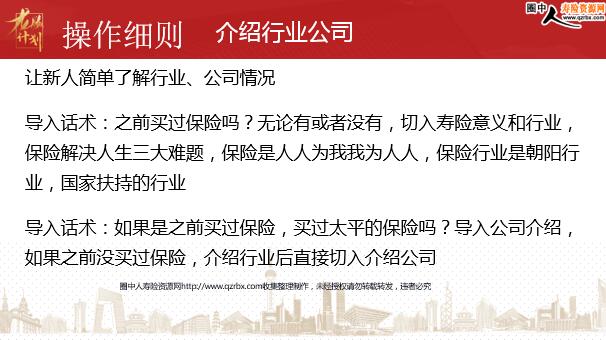 龙腾绝唱 五日围城 操作细则 30表格 操作细则 第一步 计划与活动 操作细则 增员对象选择 ------按行业分类 操作细则 增员对象选择 -----按人员分类 操作细则 主要目标三类人群 操作细则 准增员对象30登记表 操作细则 第二步 邀约、填表 操作细则 邀约/填表话术 ××先生/女士:告诉你一个好消息,为庆祝我公司成功入围“世界500强”,集团斥巨资打造一项“人才引进”计划(龙腾计划),学习就给2000元学习津贴,只有5天时间,名额有限,赶紧来公司面试吧,而且有专家免费为你测试性格,你是今天上午还是下午有时间呢? 操作细则 填写说明:你是个爱说话还是文静的人呢?如果你觉得你是一个很爱说话的人,请勾1;如果你觉得你是一个有点爱说话的人,请勾2;如果你觉得你是一个很文静的人,请勾4;如果你觉得你是一个有点文静的人,请勾3。依此类推。 性向测试 操作细则 第三步 面试 面试 操作细则 面试官面试流程 操作细则 寒暄赞美话术:从哪来?什么地方人?怎么来的?热不热?