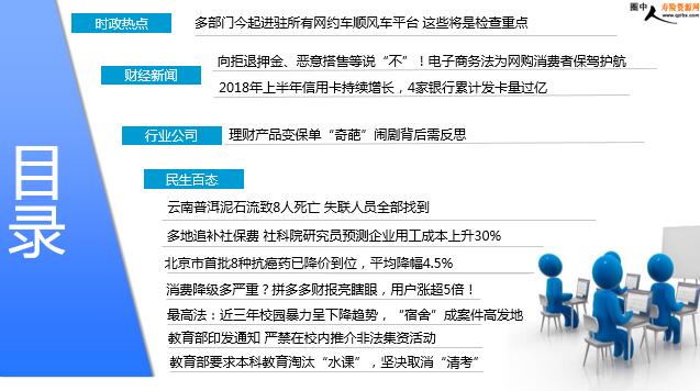 每日新闻速递 2018年9月6日 星期四 目录 时政热点 财经新闻 行业公司 民生百态 多部门今起进驻所有网约车顺风车平台 这些将是检查重点 向拒退押金、恶意搭售等说“不”!电子商务法为网购消费者保驾护航 2018年上半年信用卡持续增长,4家银行累计发卡量过亿 理财产品变保单“奇葩”闹剧背后需反思 云南普洱泥石流致8人死亡 失联人员全部找到 多地追补社保费 社科院研究员预测企业用工成本上升30% 北京市首批8种抗癌药已降价到位,平均降幅4.5% 消费降级多严重?拼多多财报亮瞎眼,用户涨超5倍! 最高法:近三年校园暴力呈下降趋势,“宿舍”成案件高发地 教育部印发通知 严禁在校内推介非法集资活动 教育部要求本科教育淘汰“水课”,坚决取消“清考” 时政热点 多部门今起进驻所有网约车顺风车平台 这些将是检查重点 2018/09/04 16:20 来源:人民网 近一段时间以来,社会上连续发生多起滴滴司机杀害乘客、性侵、性骚扰事件,特别是8月24号发生的浙江温州乐清女孩乘坐滴滴顺风车途中被害案件,引起社会高度关注和极大愤慨。8月31日,交通运输新业态协同监管部际联席会议第二次会议决定从今天起在全国范围内对所有网约车顺风车平台公司开展进驻式全面检查。目的是以“8·24”乐清案件为切入点,立即开展安全专项检查——要坚持“全面覆盖、突出重点”的原则;要强化部门协同配合,形成检查合力;要以安全为核心,开展全面检查;要强化对存在问题的整改与问责;要加快形成安全监管的长效机制。 财经新闻 向拒退押金、恶意搭售等说“不”!电子商务法为网购消费者保驾护航 2018-09-05 07:19 来源:新华网 日前,《中华人民共和国电子商务法》经第十三届全国人民代表大会常务委员会第五次会议表决通过,将于2019年1月1日起施行。作为我国电商领域首部综合性法律,该法明确规定了电子商务各方主体的合法权益,规范了电子商务行为,为网购消费者撑起了法律的“保护伞”。近年来,电子商务飞速发展,利用朋友圈、网络直播等渠道进行的销售行为层出不穷。微商、网络销售是否属于电子商务经营者,个人开网店会不会有“门槛”?根据电子商务法规定:本法所称电子商务经营者,是指通过互联网等信息网络从事销售商品或者提供服务的经营活动的自然人、法人和非法人组织。