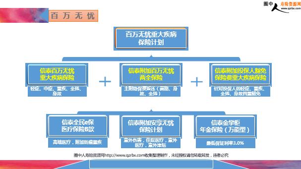 千万人生·百万无忧 信泰百万无忧重大疾病保险 信泰千万人生养老年金保险 信泰人寿保险股份有限公司 信泰百万无忧重大疾病保险计划 市场爆款信泰百万无忧综合保障计划 第一重突破——恶性肿瘤 恶性肿瘤2次赔,第二次恶性肿瘤可以是新发复发持续转移两次恶性肿瘤的间隔期3年 三列分别是癌症、急性心梗、脑中风 恶性肿瘤单列的意义 癌症发病率的量级 第二重突破——中症解决轻症不轻,重症不重的问题 第三重突破——轻、中症不分组减少限制 扩大权益 百万无忧重大疾病保险计划 信泰百万无忧重大疾病保险 信泰附加百万无忧两全保险 信泰附加投保人豁免保险费重大疾病保险 轻症、中症、重疾、全残、身故 主附险保费返还(满期、身故、全残) 针对投保人的轻症、重疾、全残、身故四重豁免 信泰全民e保医疗保险B款 高端医疗,附加防癌重疾 信泰金掌柜年金保险(万能型) 最低保证利率3.0% 信泰附加安享无忧保险计划 意外伤害,住院医疗,意外医疗,意外津贴 轻症:30种轻症,不分组,赔付2次,每次赔付30%保额,间隔期90天;中症: 20种中症,不分组,赔付2次,每次赔付50%保额,间隔期90天;重疾:1、恶性肿瘤(单独成组),赔付2次,针对复发、转移、新发,赔付保额,间隔期3年;