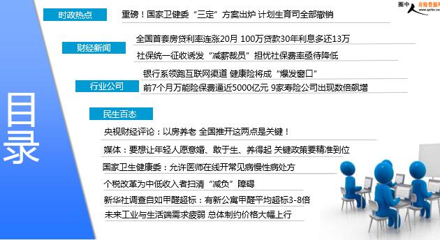 每日新闻速递 2018年9月12日 星期三 目录 时政热点 财经新闻 行业公司 民生百态 重磅!国家卫健委“三定”方案出炉 计划生育司全部撤销 全国首套房贷利率连涨20月 100万贷款30年利息多还13万 社保统一征收诱发“减薪裁员”担忧社保费率亟待降低 银行系领跑互联网渠道 健康险将成“爆发窗口” 前7个月万能险保费逼近5000亿元 9家寿险公司出现数倍飙增 央视财经评论:以房养老 全国推开这两点是关键! 媒体:要想让年轻人愿意婚、敢于生、养得起 关键政策要精准到位 国家卫生健康委:允许医师在线开常见病慢性病处方 个税改革为中低收入者扫清“减负”障碍 新华社调查自如甲醛超标:有新公寓甲醛平均超标3-8倍 未来工业与生活端需求疲弱 总体制约价格大幅上行 时政热点 重磅!国家卫健委“三定”方案出炉 计划生育司全部撤销 2018年09月10日 02:05:39 来源:人民日报 按照3月31日国务院机构改革推进会提出的“时间表”,中央机构“定职责、定机构、定编制”的“三定方案”要在6月底之前印发执行。在规定时间过去将近三个月之后,各部委的“三定方案”终于有了动静。先来说说最近很受关注的国家卫生健康委员会。政知道发现,随着“卫计委”变成“卫健委”,新部门的21个内设机构中,有3个与“计生”有关的司局都发生了变化,2个被撤销,1个更名。顺便预告一下,今天起,政知君将陆续推出新部委“三定方案”的解读,欢迎关注。 财经新闻 全国首套房贷利率连涨20月 100万贷款30年利息多还13万 2018-09-11 10:20 来源:澎湃新闻 房贷利率连续20个月上涨,但近一年上升城市的数量,呈现连续波动并下降的趋势,近三个月城市数量变化近乎直线下降,各城市在先后完成利率调整后,再度出现变动的情况呈减少趋势。融360最新发布的报告显示,8月全国首套房贷款平均利率保持上涨,达到5.69%,环比上升0.35%,同比上升11.13%,为连续20个月上涨。报告认为,当前房贷市场政策指向仍偏紧,未来房贷利率或保持低幅上涨。