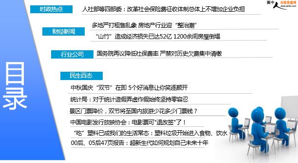 每日新闻速递 2018年9月20日 星期四 目录 时政热点 财经新闻 行业公司 民生百态 人社部等四部委:改革社会保险费征收体制总体上不增加企业负担 多地严打租售乱象 房地产行业迎“整治潮” “山竹”造成经济损失已达52亿 1200余间房屋倒塌 国务院再议降低社保费率 严禁对历史欠费集中清缴 “山竹”触发广东巨灾指数保险 中秋国庆“双节”在即 5个好消息让你笑逐颜开 统计局:对于统计造假弄虚作假始终坚持零容忍 景区门票降价,双节将至国内旅游少花多少门票钱? 中国电影发行放映协会:电影票可"退改签"了! “吃”塑料已成我们的生活常态:塑料垃圾开始进入食物、饮水 00后、05后47页报告:超新生代如何规划自己未来十年 时政热点 人社部等四部委:改革社会保险费征收体制总体上不增加企业负担 2018-09-19 10:07 来源:国家税务总局网站 统一社保费征收主体,将提高社保费征收效率,有利于促进各类企业职工参保缴费,更好地维护职工权益。上述改革将为降低社会保险费率、减轻企业及职工缴费负担创造有利条件。按照国务院常务会议精神,我们将认真进行分析测算,抓紧研究提出适当降低社保费率、确保总体上不增加企业负担的政策措施。 财经新闻 多地严打租售乱象 房地产行业迎“整治潮” 2018-09-19 09:13 来源: 经济参考报 18日,上海发布《关于开展2018年房地产市场秩序专项整治的通知》,要求到2018年底,住建委、房管局、公安局、司法局、税务局、银监局等多个部门联合开展房地产市场专项整治工作,重点打击虚假信息、投机炒房、虚拟交易、违规收费、违规提取住房公积金等违法违规行为。截至目前,上海、北京、广州、深圳、海南、天津、南京、苏州、合肥、厦门等地多部门联合开展专项行动,打击房地产领域侵害群众利益违法违规行为,治理房地产市场乱象。中原地产首席分析师张大伟表示,从8月开始,全国已经有超过50个城市发布了对房地产市场秩序的专项整治,严打租售乱象。