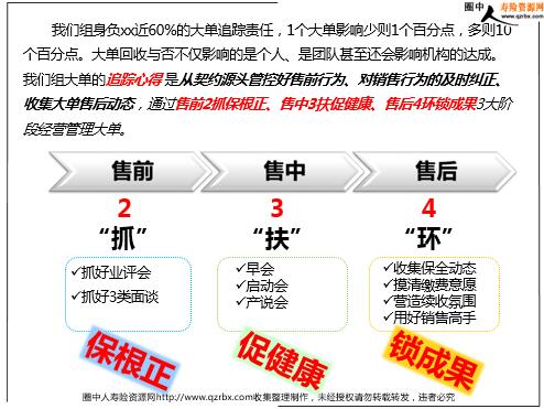 售前两抓、售中三扶、售后四环 大单回收,走你 2005年5月 入司,2010年 晋升主任小组人力:6人 荣誉: 12年中区金质、13年中区银质 我们组身负xx近60%的大单追踪责任,1个大单影响少则1个百分点,多则10个百分点。大单回收与否不仅影响的是个人、是团队甚至还会影响机构的达成。我们组大单的追踪心得 是从契约源头管控好售前行为、对销售行为的及时纠正、收集大单售后动态,通过售前2抓保根正、售中3扶促健康、售后4环锁成果3大阶段经营管理大单。 2 “抓” 3 “扶” 4 “环” 抓好业评会抓好3类面谈 早会启动会产说会 收集保全动态摸清缴费意愿营造续收氛围用好销售高手 保根正 促健康 锁成果 售中 售后 售前 售前——“根正”销售观念和标准 保单出问题,除开客户因素外,往往是因业务员在销售过程中出现偏差导致的,而差异的大小直接决定着解决保单的难易程度。我们通过抓好业评会的宣导平台、对重点抓好面谈 的方式树立正确的大单销售观念和行为。 2抓,保根正 每月直通营业单位展示业评会成果,传达精神 新人面谈晋升节奏重磅方案 “售前”解读——借机构业评会成果做好宣导
