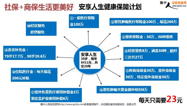 乙类817种自付10%-35%包括药品和检查 自付部分 进口药特效药医疗设备医疗服务项目 通常是300元到1500元不等 通常30万封顶 中间部分才是我们真正可以报销的费用! 自费内容 甲类1800多种 丙类,自付100%国产18万多种,进口近9000种 医保七不管: 1、异地就医不管; 2、住院有封顶; 3、意外不管,包括交通意外; 4、第三者责任不管; 5、丙类药不管; 6、住院费起付线以内不管; 7、门诊不管 ③重疾保险金:30万,80种重疾 ④轻度重疾9万,涵盖30种,赔付三次共27万 ⑥恶性肿瘤关爱金额外给付6万 ⑤疾病身故金30万、意外身故金30万,特定意外身故金30万 ⑧住院医疗金:每天最高200元补贴 ①一般医疗保险金100万 ②恶性肿瘤医疗保险金100万,最高200万 ⑦意外伤害医疗费用补偿金3万重症监护室费用补偿6万 ⑩轻症豁免 房贷豁免 ⑨养老补充金: 70岁17.7万,80岁20.6万 社保+商保生活更美好 每天只需要23元 安享人生健康保障计划 五周年绿通服务解决看病难