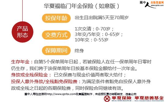 福临门年金保险(如意版) 荣耀上市 演绎传奇 人不一定發生意外,也不一定身患重疾但是一定會慢慢變老養老是每个人必須面對的剛性需求 养老金储备方式对比 ——融360《储备养老金的几种方式》 养老筹划,我们需要是安全可靠,保障全面,确保专款专用,不被挪用。 保障全面 长期稳定保障提前规划,年金固定给付资金安全 专款专用合同明确利益,监管严格规范 保单价值 灵活使用保单抵押贷款,满足急时之需 年金保险给你一个确定而有尊严的老年生活 福临门年金保险(如意版)智慧之选 一生经典 1次交清:0-70岁; 3年交/5年交:0-65岁; 10年交:0-55岁 产品形态 出生且出院满5天至70周岁 终身 投保年龄 交费方式 保障期间 生存年金:自第5个保单周年日起,若被保险人在任一保单周年日零时仍生存,我们将于该保单周年日按基本保险金额给付一次年金。身故或全残保险金: 已交保费与现金价值两者取大给付;投保人意外身故/全残豁免保险费:为满足条件者豁免自投保人意外身故或全残之日起的各期保险费,同时保险合同继续有效。 华夏福临门年金保险(如意版) 买了福临门,没搭万能险,生存金怎么领? 生存金领取方式 1.为什么会出现福临门未搭配万能账户情况?答:由于福临门年金和新万能险上市日期可能存在一定间隔,此期间内客户投保的福临门年金将暂时没有万能账户搭配。 2.没有搭万能险,未领取的生存金如何处理?答:未领取的生存金,将自动累计生息。 3.累计生息的利率是多少?答:当前利率为3.5%,公司保留利率调整权。 4.搭配的万能险上市后,是否可申请搭配?答:可以。可直接通过微信投保搭配万能账户。