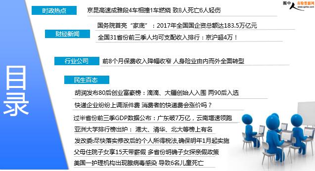 每日新闻速递 2018年10月25日 星期四 目录 时政热点 财经新闻 行业公司 民生百态 京昆高速成雅段4车相撞1车燃烧 致8人死亡6人轻伤 国务院首亮“家底”:2017年全国国企资总额达183.5万亿元 全国31省份前三季人均可支配收入排行:京沪超4万! 前8个月保费收入降幅收窄 人身险业由内而外全面转型 胡润发布80后创业富豪榜:滴滴、大疆创始人入围 两90后入选 快递企业纷纷上调派件费 消费者的快递费会涨价吗? 过半省份前三季GDP数据公布:广东破7万亿,云南增速领跑 亚洲大学排行榜出炉: 港大、清华、北大等榜上有名 发改委:尽快落实修改后的个人所得税法,确保明年1月起实施 父母住院子女享15天带薪假 多省份明确子女探亲假政策 美国一护理机构出现腺病毒感染 导致6名儿童死亡 时政热点 京昆高速成雅段4车相撞1车燃烧 致8人死亡6人轻伤 2018-10-24 08:24 来源:四川在线 四川省公安厅交通警察总队高速公路四支队官方微博发布[关于G5京昆高速公路成雅段“10.23”道路交通事故的情况通报]。通报称,2018年10月23日19时许,G5京昆高速公路成雅段雅安往成都方向1917KM+350M处发生一起4车相撞的道路交通事故,其中一车燃烧。事故造成8人死亡,6人轻伤已及时送医治疗。 财经新闻 国务院首亮“家底”:2017年全国国企资总额达183.5万亿元 2018-10-24 11:35 来源:观察者网 今日《2017年度国有资产管理情况的综合报告》提请十三届全国人大常委会第六次会议审议。根据报告,2017年,全国国有企业资产总额183.5万亿元(人民币,下同),负债总额118.5万亿元,国有资本及权益总额50.3万亿元。全国国有企业境外总资产16.7万亿元。其中,在企业国有资产(不含金融企业)方面,2017年,中央国有企业资产总额76.2万亿元,负债总额51.9万亿元,国有资本及权益总额16.2万亿元,资产负债率68.1%;地方国有企业资产总额107.3万亿元,负债总额66.6万亿元,国有资本及权益总额34.1万亿元,资产负债率62%。