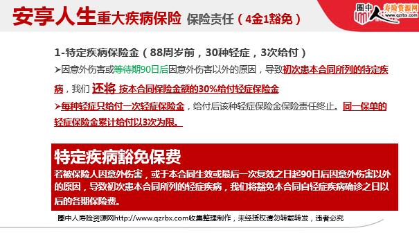 安享人生产品介绍 公司介绍—产品概览 聆听需求、不断创新、引领行业潮流!移动展业超强的竞争力:PAD展业&H5展业 疾病意外 无强制性 安全、稳定转移 幸福人生靠规划而非运气 人生风险:疾病、意外、生存金(子女成长规划金&养老金)、传承风险 收入 疾病&身故 3.面对高昂的治疗费用不得不缩减生活费用甚至无法履行抚养儿女赡养老人的责任 1.保障不足只得取出积蓄用于应急 2.积蓄用光,需要使用其他开支房贷无力偿还,银行收回企业现金流断裂,面临倒闭 幸福人生靠规划而非运气 触目惊心的数字 全国恶性肿瘤发病率 ----数据来自全国肿瘤登记中心发布的《中国肿瘤登记年报》 35岁至39岁年龄段为87.07/10万; 40岁至44岁年龄段几乎翻番,达到154.53/10万; 50岁以上人群发病占全部发病的80%以上; 60岁以上癌症发病率超过1%; 80岁达到高峰。 健康风险的发生是公平的 不因人的身份地位而发生改变 高枫PCP肺炎35岁 阿桑乳癌 34岁 李钰淋巴癌33岁 网易代理CEO孙德棣年仅38岁 疾病本身并非最大的风险 随着医学的进步,重大疾病的存活率在大大提高大部分器官移植手术术后存活率已达到90%以上; 45岁以下患有心脏病的成年人,手术后80%可以存活3年以上甚至更久从被确诊患癌症开始,5年后依然存活的概率:男性为65%,女性为78% 2/3的中风病人可以治愈… 但这一切的前提是要有充足的医疗费。 高额的医疗费用才是不确定的风险