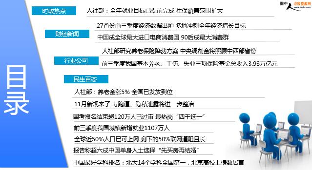 每日新闻速递 2018年11月2日 星期五 目录 时政热点 财经新闻 行业公司 民生百态 人社部:全年就业目标已提前完成 社保覆盖范围扩大 27省份前三季度经济数据出炉 多地冲刺全年经济增长目标 中国成全球最大进口电商消费国 90后成最大消费群 人社部研究养老保险降费方案 中央调剂金将照顾中西部省份 前三季度我国基本养老、工伤、失业三项保险基金总收入3.93万亿元 人社部:养老金涨5% 全国已发放到位 11月新规来了 毒跑道、隐私泄露将进一步整治 国考报名结束超120万人已过审 最热岗“四千选一” 前三季度我国城镇新增就业1107万人 全球近50%人口已可上网 剩下的50%联网道阻且长 报告称超六成中国单身人士选择“先买房再结婚” 中国最好学科排名:北大14个学科全国第一,北京高校上榜数居首 时政热点 人社部:全年就业目标已提前完成 社保覆盖范围扩大 2018-11-01 09:11:54 来源:人民日报 “综合就业统计监测和调研情况看,前三季度我国就业形势总体稳定。”人社部新闻发言人卢爱红说。核心指标运行良好。城镇新增就业平稳增长,1—9月累计城镇新增就业达到1107万人,比去年同期增加了10万人,提前一个季度完成了全年目标任务;9月份全国城镇调查失业率为4.9%,同比略有下降;三季度末全国城镇登记失业率3.82%,降至多年来低位。重点群体就业稳中向好。1—9月,就业困难人员实现就业136万人,同比增加3万人。“虽然今年有820万高校毕业生,但就业总体稳定,农村劳动力转移就业也稳中有进。”卢爱红说。供求基本平稳。对100个城市公共就业服务机构市场供求数据的分析显示,三季度人力资源市场的求人倍率为1.25,环比、同比均有所上升。 财经新闻 27省份前三季度经济数据出炉 多地冲刺全年经济增长目标 2018-11-01 07:25 来源:经济参考报 截至10月31日,已有27个省份公布了前三季度经济运行“成绩单”。其中,云南、贵州、江西等15个省份经济增速快于全国6.7%的GDP增速;河北、上海、天津等10个省份经济增速低于全国。西部省份成为经济增速中的“黑马”。多数省份经济结构调整步伐明显加快。距离完成全年经济目标任务已进入倒计时阶段。《经济参考报》记者获悉,10月中下旬以来,多地密集召开经济形势调度会议,部署四季度工作重点。扩大和推进重大项目投资、进一步促进消费等成为地方经济保增长的重头戏。