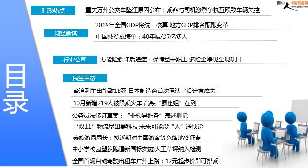 每日新闻速递 2018年11月3日 星期六 目录 时政热点 财经新闻 行业公司 民生百态 重庆万州公交车坠江原因公布:乘客与司机激烈争执互殴致车辆失控 2019年全国GDP将统一核算 地方GDP排名酝酿变革 中国减贫成绩单:40年减贫7亿多人 万能险骤降后遗症:保障型未跟上 多险企净现金现缺口 台湾列车出轨致18死 日本制造商首次承认“设计有疏失” 10月新增219人被限乘火车 高铁“霸座姐”在列 公务员法修订草案:“非领导职务”表述删除 “双11”物流尽出黑科技 未来可能没“人”送快递 泰旅游局局长:拟近期对中国游客等免落地签证费 中小学校园塑胶跑道新国标实施:人工草坪纳入检测 全国首辆自动驾驶出租车广州上路:12元起步价即可搭乘 时政热点 重庆万州公交车坠江原因公布:乘客与司机激烈争执互殴致车辆失控 2018-11-02 10:22 来源:人民网 根据调查事实,乘客刘某在乘坐公交车过程中,与正在驾车行驶中的公交车驾驶员冉某发生争吵,两次持手机攻击正在驾驶的公交车驾驶员冉某,实施危害车辆行驶安全的行为,严重危害车辆行驶安全。冉某作为公交车驾驶人员,在驾驶公交车行进中,与乘客刘某发生争吵,遭遇刘某攻击后,应当认识到还击及抓扯行为会严重危害车辆行驶安全,但未采取有效措施确保行车安全,将右手放开方向盘还击刘某,后又用右手格挡刘某的攻击,并与刘某抓扯,其行为严重违反公交车驾驶人职业规定。乘客刘某和驾驶员冉某之间的互殴行为,造成车辆失控,致使车辆与对向正常行驶的小轿车撞击后坠江,造成重大人员伤亡。 财经新闻 2019年全国GDP将统一核算 地方GDP排名酝酿变革 2018-11-02 07:03 来源: 21世纪经济报道 根据中共国家统计局党组关于巡视整改进展情况的通报,国家统计局将加快推进地区生产总值统一核算。认真落实中办、国办印发的《地区生产总值统一核算改革方案》,在浙江、湖北、陕西进行统一核算试点,于2019年在全国正式实施,实现地区GDP与国家GDP基本衔接。11月1日,某城市统计局核算负责人告诉21世纪经济报道记者,今年一些城市名义GDP大增,是因为前三季度GDP核算数据为省级统计局掌握,而明年全国推行类似改革后,各地GDP总量排名或出现较大变化。