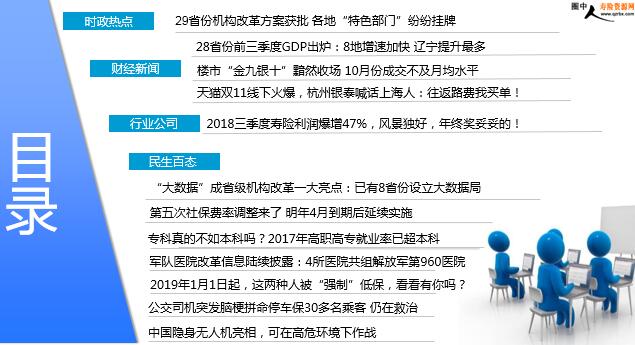 每日新闻速递 2018年11月6日 星期二 目录 时政热点 财经新闻 行业公司 民生百态 29省份机构改革方案获批 各地“特色部门”纷纷挂牌 28省份前三季度GDP出炉:8地增速加快 辽宁提升最多 楼市“金九银十”黯然收场 10月份成交不及月均水平 天猫双11线下火爆,杭州银泰喊话上海人:往返路费我买单! 2018三季度寿险利润爆增47%,风景独好,年终奖妥妥的! “大数据”成省级机构改革一大亮点:已有8省份设立大数据局 第五次社保费率调整来了 明年4月到期后延续实施 专科真的不如本科吗?2017年高职高专就业率已超本科 军队医院改革信息陆续披露:4所医院共组解放军第960医院 2019年1月1日起,这两种人被“强制”低保,看看有你吗? 公交司机突发脑梗拼命停车保30多名乘客 仍在救治 中国隐身无人机亮相,可在高危环境下作战 时政热点 29省份机构改革方案获批 各地“特色部门”纷纷挂牌 2018-11-05 01:20 来源:中国新闻网 今年9月,中办、国办印发了《海南省机构改革方案》,这是全国首个获得中央批复同意的地方机构改革方案。此后,省一级的机构改革方案密集获批。根据公开报道,截至目前,已有至少29省份的机构改革方案获中央批复同意,部分省份还透露了当地的党政机构设置数量。例如,在此次机构改革后,宁夏的党政机构总数为55个;重庆的党政机构总数为64个,其中市委机构17个,市政府机构47个。 财经新闻 28省份前三季度GDP出炉:8地增速加快 辽宁提升最多 2018-11-05 07:03 来源: 中新经纬 从GDP增速上来看,就目前已公布数据的28个省份中,已有云南、贵州、江西、陕西、福建、安徽、四川、湖北、湖南、浙江、河南、宁夏、广西、广东、青海等15个省份增速超过全国水平(6.7%)。其中,云南以9.1%的增速暂列第一。与全国GDP增速持平的是北京、江苏两地,另外,上海、河北、山东、重庆、甘肃、山西、海南、辽宁、内蒙古、黑龙江、天津等11省份GDP增速低于全国水平。其中,天津以3.5%的增速暂居末位。