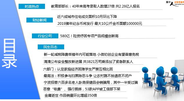每日新闻速递 2018年11月8日 星期四 目录 时政热点 财经新闻 行业公司 民生百态 教育部部长:40年来高考录取人数增27倍 共2.28亿人报名 近六成城市住宅成交面积10月环比下降 2019猪年纪念币将发行 最大10公斤金币面额100000元 580亿!险资纾困专项产品规模创新高 新一轮减税降费举措年内可能落地 小微初创企业有望普惠免税 滴滴公布安全整改新进展 共3821万司乘添加了紧急联系人 六部门:认定家庭经济困难学生严禁互相比困 最高法:积极参与扫黑除恶斗争 让农村路不拾遗夜不闭户 宁波招募六百多名老人卧底保健品会销骗局,其中一半受过骗 恶意“吸费”、强行捆绑,53款APP被工信部下架 金庸逝世 作品销量环比增超350倍 时政热点 教育部部长:40年来高考录取人数增27倍 共2.28亿人报名 2018-11-06 21:26 来源:北京日报 在波澜壮阔的改革开放进程中,教育是先行者,是受益者,更是助力者。11月6日上午,由中宣部、教育部、北京市委等主办的“将改革开放进行到底”系列论坛第二场开讲,教育部党组书记、部长陈宝生透露,1977年恢复高考当年,全国高招仅录取27万人,2017年录取人数增至761万,增加27倍多。40年来,我国累计有2.28亿人报名参加高考,高等教育已培养了9900万名高素质专门人才。他表示,高考仍是教育的“指挥棒”、社会的“稳定器”,未来的高考改革“只会越改越好”。 财经新闻 近六成城市住宅成交面积10月环比下降 2018-11-07 09:04 来源:中国经济网 10月以来,各地继续坚持房地产市场调控目标不动摇、力度不放松。在保持政策连续性稳定性的基调下,市场成交量继续低位徘徊。11月6日,中国指数研究院公布的数据显示,2018年10月受监测的40个主要城市成交面积环比下降5.91%,其中,近六成城市环比下降;同比则上升3.32%。具体来看,4个一线城市成交面积环比下降33.44%,其中,广州降幅较大,为57.93%;同比增长11.32%,其中,上海增幅显著。18个二线城市成交面积环比下降4.92%,同比微升0.37%。8个三线城市成交面积较上月上升21.6%,同比增加8.54%。