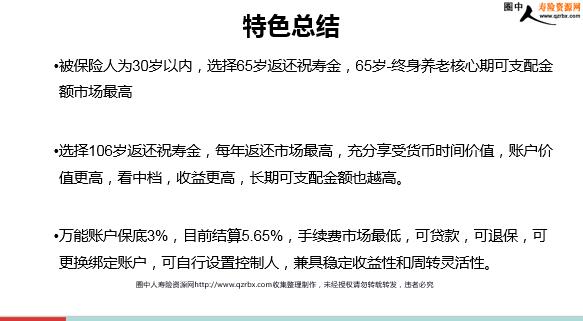 天安 其他险种 提供与生命等长的现金流! 流出 提供资料:保险合同;投保人有效身份证件申请时间:犹豫期后可申请;退还金额:解除合同申请日当时的合同现金价值谁能退:投保人; 退保需收取费用 *已关联鑫如意的传家福、欢乐颂的客户退保后可再次投保(未停售)或指定其他万能账户; 运作·流出详解(3/3) 本资料仅供内部学习使用 注:以上仅供理解,具体请以条款为准 被保险人为30岁以内,选择65岁返还祝寿金,65岁-终身养老核心期可支配金额市场最高 选择106岁返还祝寿金,每年返还市场最高,充分享受货币时间价值,账户价值更高,看中档,收益更高,长期可支配金额也越高。 万能账户保底3%,目前结算5.65%,手续费市场最低,可贷款,可退保,可更换绑定账户,可自行设置控制人,兼具稳定收益性和周转灵活性。 特色总结 一份纯正的资产型保单 从回报时间看 从长期增长看 从长期增长看