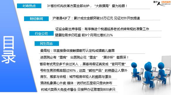 每日新闻速递 2018年11月19日 星期一 目录 时政热点 财经新闻 行业公司 民生百态 31省份机构改革方案全部出炉,“大数据局”最为抢眼! 沪港通4岁了:累计成交金额突破10万亿元 见证对外开放提速 证监会副主席李超:有序推进个税递延养老试点转常规的准备工作 健康险需求仍旺盛 前9个月同比增长21% 最高检:非直接身体接触猥亵可认定构成猥亵儿童罪 进医院必有“重病” 出医院必花“重金” “黑诊所”套路深! 省级考试凭空多千余过关人 ,黑客将假证真变成“官网可查” 号称生男孩概率超过90%,这类“碱性产品”的销量让人意外 房东、搬家与合租:城市租房年轻人的脆弱与漂泊 酒店乱象黑心外卖 媒体:说好的五星级只是块抹布 杭城犬类各大免疫点爆仓 日接种办证激增到800多只 时政热点 31省份机构改革方案全部出炉,“大数据局”最为抢眼! 2018-11-17 22:31 来源:新华社 上海市委、市政府近日召开机构改革动员会,明确机构改革任务书,对全面推进改革进行动员部署。至此,我国31个省份机构改革方案全部“出炉”。作为深化党和国家机构改革的重要组成部分,地方机构改革全面实施,按照既定“施工图”和“时间表”,蹄疾步稳向前迈进。1、突出“红线”:坚持加强党的全面领导。2、有“加”有“减”:上下贯通+优化协同。3、问题导向:深化“放管服”“硬招”频出。4、因地制宜:“自选动作”亮点多。 财经新闻 沪港通4岁了:累计成交金额突破10万亿元 见证对外开放提速 2018-11-17 17:00:49 来源:新华社 作为跨境双向投资开放的“破冰”之举,沪港通17日迎来开闸四周年。累计成交金额突破10万亿元、经历三件大事,“四岁”沪港通不仅促进了内地与香港市场的融合,更见证了中国资本市场对外开放的持续提速。来自上海证券交易所的最新统计显示,截至11月16日,平稳运行四年的沪港通累计成交金额达10.31万亿元人民币。其中,沪股通累计共930个交易日,交易金额6.05万亿元人民币,日均交易金额65.02亿元人民币;港股通累计共912个交易日,交易金额4.27万亿元人民币,日均交易金额46.77亿元人民币。