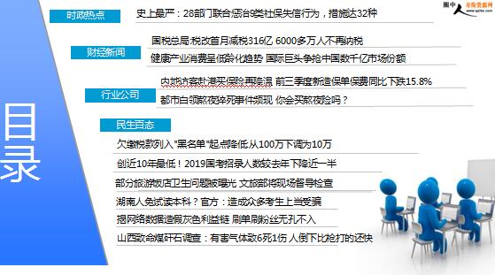 每日新闻速递 2018年12月4日 星期二 目录 时政热点 财经新闻 行业公司 民生百态 史上最严:28部门联合惩治9类社保失信行为,措施达32种 国税总局:税改首月减税316亿 6000多万人不再纳税 健康产业消费呈低龄化趋势 国际巨头争抢中国数千亿市场份额 内地访客赴港买保险再降温 前三季度新造保单保费同比下跌15.8% 都市白领熬夜猝死事件频现 你会买熬夜险吗? 欠缴税款列入"黑名单"起点降低:从100万下调为10万 创近10年最低!2019国考招录人数较去年下降近一半 部分旅游饭店卫生问题被曝光 文旅部将现场督导检查 湖南人免试读本科?官方:造成众多考生上当受骗 揭网络数据造假灰色利益链 刷单刷粉丝无孔不入 山西致命煤矸石调查:有害气体致6死1伤 人倒下比枪打的还快 时政热点 史上最严:28部门联合惩治9类社保失信行为,措施达32种 2018-12-03 08:33 来源:澎湃新闻 联合惩戒的对象是指人力资源社会保障部、税务总局和医疗保障局会同有关部门确定的违反社会保险相关法律、法规和规章的企事业单位及其有关人员,其严重失信、失范行为主要包括以下情形: (一)用人单位未按相关规定参加社会保险且拒不整改的; (二)用人单位未如实申报社会保险缴费基数且拒不整改的; (三)应缴纳社会保险费却拒不缴纳的; (四)隐匿、转移、侵占、挪用社会保险费款、基金或者违规投资运营的; (五)以欺诈、伪造证明材料或者其他手段参加、申报社会保险和骗取社会保险基金支出或社会保险待遇的; (六)非法获取、出售或变相交易社会保险个人权益数据的; (七)社会保险服务机构违反服务协议或相关规定的; (八)拒绝协助社会保险行政部门、经办机构对事故和问题进行调查核实的; (九)其他违反法律法规规定的。 财经新闻 国税总局:税改首月减税316亿 6000多万人不再纳税 2018-12-03 07:22 来源:人民日报 国家税务总局近日发布的数据显示:个人所得税改革实施首月,全国个人所得税减税316亿元,有6000多万税改前的纳税人不再缴纳工资薪金所得个人所得税。10月1日个人所得税改革启动以来的首个申报期运行平稳,10月份发放的工资薪金所得和个体工商户取得的生产、经营所得已完成申报。数据显示,改革实施首月,工资薪金所得减税304.1亿元,减税幅度41.3%,工薪阶层普遍受益。“本次个人所得税改革优化了税率结构,大幅拉大了中低档税率级距,改革红利更多地惠及中低收入人群。”国家税务总局所得税司司长罗天舒介绍,10月领取工资薪金所得在2万元以下的纳税人,减税幅度都超过50%,占税改前纳税人总数的96.1%,减税金额达224亿元,占当月总减税规模的70.9%。