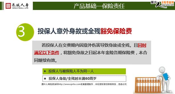 长城高泰年金保险 高泰年金 为您专属 高人一等 泰然自若 目 录 基础知识 年金保险 年金保险是指投保人或被保险人一次或按期交纳保险费,保险人以被保险人生存为条件,按年、半年、季或月给付保险金,直至被保险人死亡或保险合同期满。是人寿保险的一种,保障被保险人在年老或丧失劳动能力时能获得经济收益。 终身年金保险 定期年金保险 基础知识 年金保险 可操作性强——确定购买后,不需要操心,交费后由专人打理 锁定财富——一种强制储蓄的方式,专款专用,附带增值,抵御通胀 回报明确——提前规划退休计划,精确估算几十年后的收益 产品介绍 产品基础—投保要素 投保年龄 产品基础—保险责任 生存年金 产品基础—保险责任 身故全残保险金 已交保费与现价二者取大 产品基础—保险责任 投保人意外身故或全残豁免保险费 若投保人在交费期内因意外伤害导致身故或全残。且同时满足以下条件,将豁免身故之日起本年金险各期保险费,本合同继续有效。