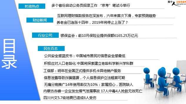 每日新闻速递 2018年12月17日 星期一 目录 时政热点 财经新闻 行业公司 民生百态 多个省份启动公务员招录工作 “京考”笔试今举行 互联网理财指数报告在深发布,六年来首次下滑,专家预测趋势 养老金已连涨十四年,2019年将停止上涨了? 银保监会:前10月保险业提供保额6165.25万亿元 公共安全感蓝皮书:中国城市居民对信息安全感最低 积极应对人口老龄化 中国将探索建立老龄科学新兴学科群 工信部:明年在全国正式提供手机卡异地销户服务 信息泄露导致诈骗猖獗,个人信息保护立法翘首可期 无痛分娩推广14年使用率仅为10%:家属担心,医院缺人 内蒙古赤峰一企业发生煤气泄漏事故 17人中毒4人抢救无效死亡 四川兴文5.7级地震已造成6人受伤 时政热点 多个省份启动公务员招录工作 “京考”笔试今举行 2018年12月16日 00:08:00 来源:中国新闻网 2019年度国考结束笔试不久,目前,北京、上海、辽宁等省份纷纷启动公务员省考招录工作。今日,被称为“京考”的北京市公务员招录考试将举行笔试。相对于被称为“国考”的中央机关及其直属机构公务员招录,以各省份为单位组织的公务员招考则被成为“省考”,其中,北京市的公务员招录又被很多考生称为“京考”。今年11月23日,在2018年度国考尚未进行笔试之际,北京就发布了该市2019年度考试录用公务员的公告。从招生人数来看,北京本次招考共有63个市级机关和16个区参加,计划招录3243人。其中,普通职位2390人;选调生职位330人;面向大学生村官等服务基层项目职位329人;面向退役大学生职位130人;面向残疾人职位22人;特殊职位33人。 财经新闻 互联网理财指数报告在深发布,六年来首次下滑,专家预测趋势 2018-12-16 10:18:00 来源:华夏时报 第二届腾讯理财通金企鹅奖暨财富高峰论坛在深圳举办。腾讯理财通、腾讯金融科技智库联合国家金融与发展实验室在论坛上发布了《2018年互联网理财指数报告》。“互联网理财短暂回调不掩长期趋势。”国家金融与发展实验室副主任、对外经济贸易大学教授殷剑峰在论坛上解读报告时指出,强监管及行业洗牌的态势下,中国互联网理财指数自2013年创建以来首次出现下滑——相比2017年,互联网理财指数从695点下降到了今年的563点,降幅超过23%。随着行业的更迭,用户更加关注理财稳健性,并流向更为合规稳健的互联网理财平台。