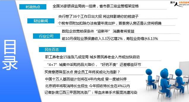 每日新闻速递 2018年12月18日 星期二 目录 时政热点 财经新闻 行业公司 民生百态 全国36家银保监局统一挂牌,省市县三级监管框架定格 央行憋了36个工作日出大招 将这样影响你的钱袋子 个税专项附加扣除办法有望年底出炉,首套房认房还是认贷将明确 数险企放宽核保条件“迎新年” 消费者将受益 前10月保险业原保费收入3.3万亿增2%,寿险业务缩水6.13% 职工养老金15连涨几成定局 城乡居民养老金入市或加快启动 “4+7”城集中采购药品大降价,“好药不贵”还差哪些环节 买房意愿降至冰点 房企员工年终奖或化为泡影? 中国十万人基因组计划将在4年内完成 曾一度被叫停 北京明年将取消特长生招生 今年招收特长生在4%以内 记者卧底江西三甲医院洗涤厂:带血床单手术服混洗遭污染 时政热点 全国36家银保监局统一挂牌,省市县三级监管框架定格 2018年12月17日 00:08:00 来源:中国新闻网 距中国银保监会挂牌八个月之后,中国银保监会派出机构赶在中国改革开放四十周年纪念日的前一天,统一挂牌,银、保监局正式合并,此时距银保监局筹备组成立整整两个月。12月17日上午10点,银保监会下辖的36个省(自治区、直辖市、计划单列市)银保监局统一挂牌,启用名为“中国银行保险监督管理委员会XX监管局”的牌子。各银保监局筹备组组长和成员、副处级及以上干部、分局主要负责人,以及当地政府分管金融的领导和金融办/局负责人等人参加了挂牌仪式。 财经新闻 央行憋了36个工作日出大招 将这样影响你的钱袋子 2018年12月17日 14:51 来源:央视 暂停了36个交易日的逆回购操作后,今天,中国人民银行宣布开展1600亿元7天逆回购操作,结束最长连停纪录!加之今日没有无逆回购到期,所以公开市场将实现净投放1600亿元。值得注意的是,本周18日,美联储将召开12月议息会议。市场普遍预期,美联储将进行年内第四次加息,中国央行跟进举措备受市场关注,而央行在周一就重启逆回购操作,引人瞩目。值得注意的是,目前,Shibor利率(上海银行间同业拆放利率)并不公布,但是从上周五的情况来看,各个期限的利率水平都处于上涨状态。这也是央行重启逆回购的重要背景。此前,央行不投放流动性,恰恰说明流动性是充裕的。但是,随着上周四和周五两个交易日,各个期限的利率出现大幅飙升,而国债期货两天大幅跳水,说明市场资金正在出现边际紧张局面。