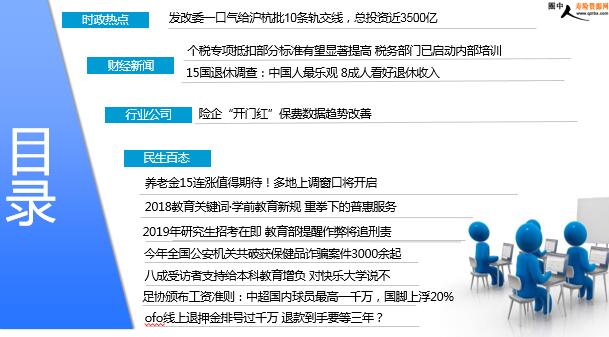 每日新闻速递 2018年12月21日 星期五 目录 时政热点 财经新闻 行业公司 民生百态 发改委一口气给沪杭批10条轨交线,总投资近3500亿 个税专项抵扣部分标准有望显著提高 税务部门已启动内部培训 15国退休调查:中国人最乐观 8成人看好退休收入 险企“开门红”保费数据趋势改善 养老金15连涨值得期待!多地上调窗口将开启 2018教育关键词·学前教育新规 重拳下的普惠服务 2019年研究生招考在即 教育部提醒作弊将追刑责 今年全国公安机关共破获保健品诈骗案件3000余起 八成受访者支持给本科教育增负 对快乐大学说不 足协颁布工资准则:中超国内球员最高一千万,国脚上浮20% ofo线上退押金排号过千万 退款到手要等三年? 时政热点 发改委一口气给沪杭批10条轨交线,总投资近3500亿 2018-12-20 11:44 来源:观察者网 2月19日,国家发改委基础产业司网站同时公示上海、杭州的城市轨道交通项目批复文件,两城共新增10条轨交线路,新增项目投资总额将近3500亿。其中,上海三期规划包括6个地铁项目以及3个市域轨道项目,杭州新增1条机场轨道快线项目;此外,杭州还调整增加3号线、5号线的投资额度。截止目前,本月已公示了四个城市的轨交建设项目。 财经新闻 个税专项抵扣部分标准有望显著提高 税务部门已启动内部培训 2018-12-20 07:37 来源: 21世纪经济报道 记者了解,近期财税部门已经在就个税专项附加扣除操作进行内部培训,为个税减税政策的切实落地做准备。从税务部门培训材料来看,部分专项附加扣除的标准,相较征求意见稿的标准有所提高。比如住房租金的扣除标准中,前两类主要城市的标准,从原来的1200元/月和1000元/月,分别提高到了1500元/月和1100元/月;大病医疗的扣除限额从原来的6万元/年提高到8万元/年。子女教育、房贷利息、赡养老人等支出如何扣税?有两种方式,一种是由单位发工资时每月预扣,一种是次年3月1日至6月30日自行汇算清缴申报办理。专项抵扣的办理,需要纳税人提供相关信息,并对填报信息的真实性负责。