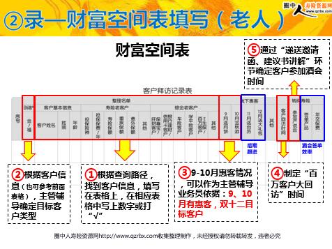 借助财富空间表 列名单 整名单 上门约访 送保障 保障检视 邀约酒会 老客转介 递送邀请函 讲理念 酒会 目标:整理出50个可上门面见的客户名单工具:财富手册+财富空间表 财富空间表 只有热名单才是真正的开门红有效名单!单纯罗列微信、手机通讯录列名单并没有意义! 冷名单 热名单 仅存在你手机微信、通信录中没有接触或者很少接触的客户 平时互动次数多、购买过xx产品、享受过多次服务的客户 双金目标客户:根据家庭年收入分高、中、低,推荐适合年缴保费和年期 双分、双福目标客户:根据家庭年收入推荐合适的保额 寿险老客户和综金客户罗列之后,不足的:从中间开始画,自己算一个,从内往外,写3个家人、10个亲戚、20个朋友、20个熟人(我认识他,他也认识我)、20个同事、20个邻居、20个见过的人(我认识他,他不认识我) ①根据查询路径,找到客户信息,填写在表格上,在相应表格中写上数字或打“√” ③9-10月惠客情况,可以作为主管辅导业务员依据:9、10月有惠客,双十二目标客户 ②根据客户信息(也可参考前面表格),主管辅导确定目标客户类型 ⑤通过“递送邀请函、建议书讲解”环节确定客户参加酒会时间