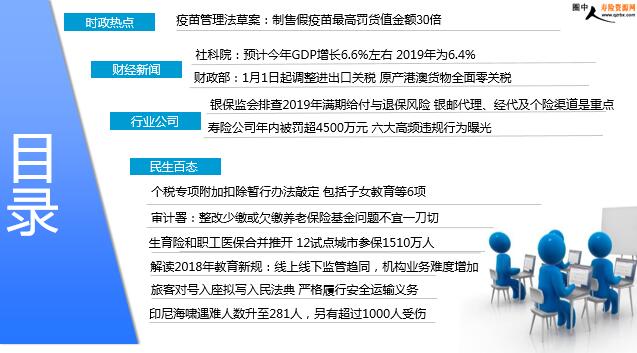 每日新闻速递 2018年12月25日 星期二 目录 时政热点 财经新闻 行业公司 民生百态 疫苗管理法草案:制售假疫苗最高罚货值金额30倍 社科院:预计今年GDP增长6.6%左右 2019年为6.4% 财政部:1月1日起调整进出口关税 原产港澳货物全面零关税 银保监会排查2019年满期给付与退保风险 银邮代理、经代及个险渠道是重点 寿险公司年内被罚超4500万元 六大高频违规行为曝光 个税专项附加扣除暂行办法敲定 包括子女教育等6项 审计署:整改少缴或欠缴养老保险基金问题不宜一刀切 生育险和职工医保合并推开 12试点城市参保1510万人 解读2018年教育新规:线上线下监管趋同,机构业务难度增加 旅客对号入座拟写入民法典 严格履行安全运输义务 印尼海啸遇难人数升至281人,另有超过1000人受伤 时政热点 疫苗管理法草案:制售假疫苗最高罚货值金额30倍 2018-12-24 07:12 来源:北京青年报 “疫苗关系人民群众生命健康,关系公共卫生安全和国家安全,是国家战略性、公益性产品。”12月23日下午,疫苗管理法草案首次提请十三届全国人大常委会第七次会议审议,国家药品监督管理局局长焦红作草案报告。这是我国首次就疫苗管理立法。疫苗管理法草案在罚款金额上更为严厉。疫苗上市许可持有人生产、销售的疫苗属于假药的,没收违法产品和违法所得,责令停产停业,撤销药品注册证书,并处违法生产、销售疫苗货值金额五倍以上十倍以下罚款,货值金额不足五万元的,并处二十五万元以上五十万元以下罚款;情节严重的,吊销药品生产许可证,并处违法生产、销售疫苗货值金额十五倍以上三十倍以下罚款,货值金额不足五万元的,处一百万元以上五百万元以下罚款。 财经新闻 社科院:预计今年GDP增长6.6%左右 2019年为6.4% 2018-12-24 12:24 来源:腾讯财经综合 中国社会科学院今天上午在京发布《经济蓝皮书:2019年中国经济形势分析与预测》。蓝皮书预测,2018年中国经济增长6.6%左右,延续总体平稳的健康发展态势。2018~2019年中国经济将在新常态下运行在合理区间,就业、物价保持基本稳定,中国经济不会发生硬着陆。明年的经济展望,预测2019年我国GDP增长率在6.4%左右,比上年回落0.2个百分点。主要有以下几个因素:一是中国的潜在经济增长率持续下滑。无论是从全球生产率的增长率还是劳动供给的增长率,还是从资本形成的增速来看,我们计算出来中国潜在经济增长率2019年是持续下滑,意味着如果不考虑重大的政策背景前提下,按照自然增长率的话,2019年的增速持续下滑。