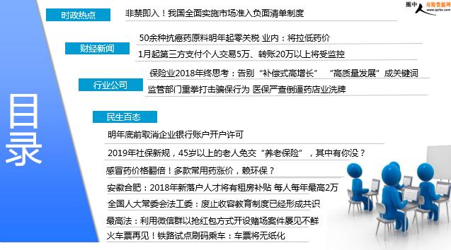 每日新闻速递 2018年12月26日 星期三 目录 时政热点 财经新闻 行业公司 民生百态 非禁即入!我国全面实施市场准入负面清单制度 50余种抗癌药原料明年起零关税 业内:将拉低药价 1月起第三方支付个人交易5万、转账20万以上将受监控 保险业2018年终思考:告别“补偿式高增长” “高质量发展”成关键词 监管部门重拳打击骗保行为 医保严查倒逼药店业洗牌 明年底前取消企业银行账户开户许可 2019年社保新规,45岁以上的老人免交“养老保险”,其中有你没? 感冒药价格翻倍!多款常用药涨价,赖环保? 安徽合肥:2018年新落户人才将有租房补贴 每人每年最高2万 全国人大常委会法工委:废止收容教育制度已经形成共识 最高法:利用微信群以抢红包方式开设赌场案件屡见不鲜 火车票再见!铁路试点刷码乘车:车票将无纸化 时政热点 非禁即入!我国全面实施市场准入负面清单制度 2018-12-25 10:04 来源:新华社 全面实施市场准入负面清单制度是党中央为加快完善社会主义市场经济体制作出的重大决策部署。国家发改委有关负责人表示,这一重大制度创新,有利于发挥市场在资源配置中的决定性作用,真正实现“非禁即入”;有利于激发市场主体活力,对各类市场主体一视同仁,实现规则平等、权利平等、机会平等;有利于政府加强事中事后监管;有利于推动相关审批体制、投资体制、监管机制、社会信用体系和激励惩戒机制改革,推进国家治理体系和治理能力现代化。清单主体包括“禁止准入类”和“许可准入类”两大类,共151个事项、581条具体管理措施,与此前的试点版负面清单相比,事项减少了177项,具体管理措施减少了288条。 财经新闻 50余种抗癌药原料明年起零关税 业内:将拉低药价 2018-12-25 07:35 来源:北京日报 多达50余种的抗癌药原料将从明年元旦起齐刷刷实现零关税,这有望助推抗癌药集体降价。财政部昨天披露,明年我国将调整部分商品的进出口关税。其中,我国将对700余项商品实施进口暂定税率,包括新增对多种药品生产原料实施零关税。这次我国将对700余项商品实施进口暂定税率。其中最为引人关注的,就是我国新增对部分药品生产原料实施零关税,这包括了多达50余种的抗癌药原料,如醋酸曲普瑞林、福美坦、依西美坦、酒石酸长春瑞滨、硫酸长春新碱、盐酸托泊替康、盐酸伊立替康,其税率均是从4%降为0;抗癌药原料来那度胺税率则是从9%直降为0。另外,罕见病药原料青霉胺、利鲁唑、波生坦的税率是从6.5%直降为0;罕见病药原料吡非尼酮则是从9%直降为0。抗血清、其他血分及免疫制品、人用疫苗等医药制品这次也有涉及,其税率是从3%直降为0。