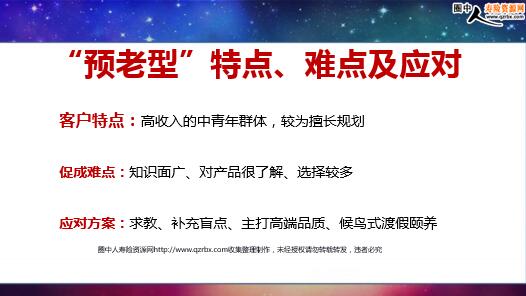 社区单销售过程中,发现这类客户观念上倾向 于三个方向,我归结为“三观” “预老型”世界观 “孝老型”价值观 “享老型”人生观 “预老型”世界观 预,预见、预防、预备。 预老型客群:深信“预则立,不预则废”,他们的世界观是 谁都靠不住,只能靠自己,深信未来的美好生活是可以通过 规划提前预见的。 “预老型”特点、难点及应对 客户特点:高收入的中青年群体,较为擅长规划 促成难点:知识面广、对产品很了解、选择较多 应对方案:求教、补充盲点、主打高端品质、候鸟式渡假颐养 “孝老型”价值观 孝老型客户群:价值观比较传统,他们会把尽孝放在首位, 如果能够尽孝又兼顾自己则锦上添花。 “孝老型”特点、难点及应对 客户特点:高收入的中年家庭群体,重伦理、重承诺 常见难点:权力分散、观念冲突 应对方案:精准沟通、重点突破 “享老型”人生观 享老型客户群:具有高度财务实力的中老年客群,他们通 常财务自由、人生观豁达,对他们来说养老社区是刚需。 “享老型”特点、难点及应对 客户特点:财务自由、要求品质、关注细节 促成难点:信任度很难建立、市场上基本所有的养老社区都了解参观体验过 应对方案:做好每一个细节、任何一个细节、贴心服务、学会倾听