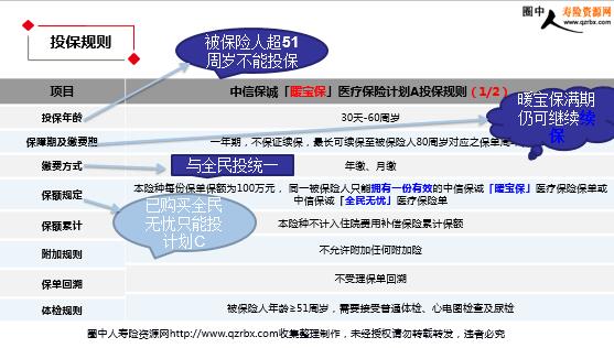 聆 听 所 至 信 诚 所 在 「全民尊享」保险计划营运培训教材 产品介绍 目 录 CONTENTS 投保规则 交单注意事项 产品介绍 对于暖宝保条款,我们销售的是A款 投保规则 被保险人年龄 月缴超200不能投保 10-17周岁买过福连系列产品的,不能投保 投保规则 月缴500元以上基本保额为12万 一般按12万计算 投保规则 *未详述部分同《中信保诚人寿保险有限公司投保规则》* 注:换算系数如下表 投保规则 被保险人超51周岁不能投保 全民投满期仍可继续续保 与全民投统一 投保规则 *未详述部分同《中信保诚人寿保险有限公司投保规则》* 投保规则 被保险人超51周岁不能投保 暖宝保满期仍可继续续保 与全民投统一 已购买全民无忧只能投计划C 投保规则 *未详述部分同《中信保诚人寿保险有限公司投保规则》*