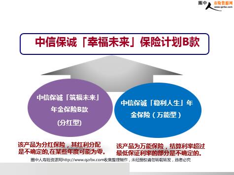 中信保诚「幸福未来」年金保险计划 B款 本计划包含分红保险,其红利分配是不确定的,在某些年度可能为零。本计划包含万能保险,结算利率超过最低保证利率的部分是不确定的。具体保险责任以保险产品合同条款为准! 中信保诚「幸福未来」保险计划B款 中信保诚「筑福未来」年金保险B款 (分红型) 中信保诚「稳利人生」年金保险(万能型) 该产品为分红保险,其红利分配是不确定的,在某些年度可能为零。 该产品为万能保险,结算利率超过最低保证利率的部分是不确定的。 中信保诚「幸福未来」保险计划B款产品卖点 本计划包含分红保险,其红利分配是不确定的,在某些年度可能为零。本计划包含万能保险,结算利率超过最低保证利率的部分是不确定的。具体保险责任以保险产品合同条款为准! 短期投入 长期回报 确定返还 安全传承 万能账户 助力增值 定制领取 费用优惠 保险责任 -「筑福未来」B款 在本主险合同有效期内,我们将承担以下保险责任: (1) 生存保险金 自本主险合同生效后的第五个保单周年日起,如果被保险人在每个保单周年日生存,我们将在每年的保单周年日(含满期日)按本主险合同基本保险金额的10%给付生存保险金,直至保险期间届满。 (2) 身故保险金 若被保险人身故,我们将按下列两者的较大者给付身故保险金,给付后本主险合同效力终止 ① 本主险合同已缴保险费-累计已领取的生存保险金; 其中,本主险合同已缴保险费按下列公式计算: 已缴保险费= 本主险合同的基本保险金额对应的年缴保险费×已缴费年期数 ② 被保险人身故当时本主险合同的现金价值。 除外责任 -「筑福未来」B款 被保险人因以下情形之一造成身故的,我们不承担给付身故保险金的责任: (1) 在本主险合同成立之日或最后复效日(以较迟者为准)起2年内自杀,但被保险人自杀时为无民事行为能力人的除外; (2) 投保人对被保险人的故意杀害、故意伤害; (3) 故意犯罪或者抗拒依法采取的刑事强制措施。 如果本主险合同有现金价值,发生上述第(1)、(3)种情形之一时,我们将向您退还现金价值,本主险合同效力终止;发生上述第(2)种情形时,我们将向其他权利人退还现金价值,本主险合同效力终止。